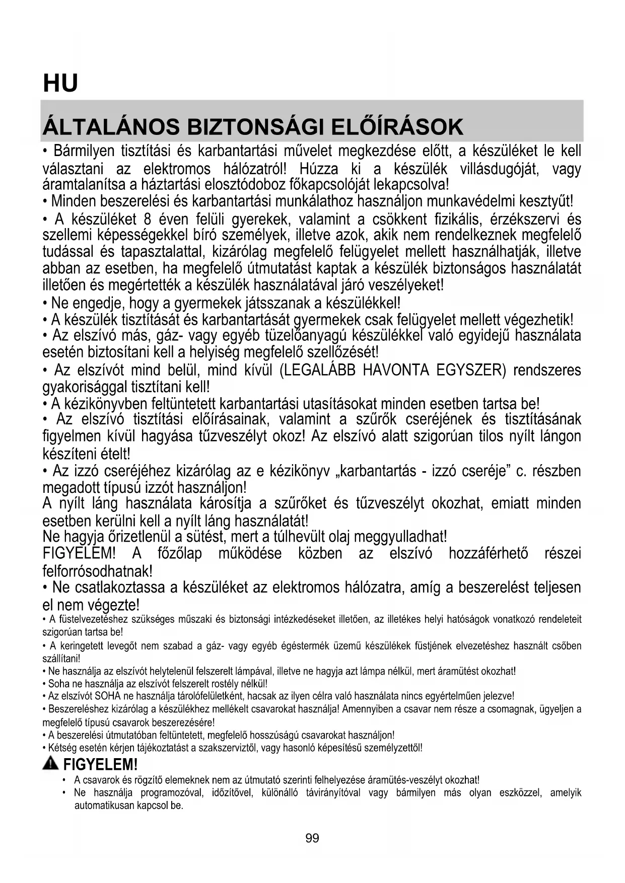 - Az elszívó tisztítási előírásainak, valamint a szűrők cseréjének és tisztításának figyelmen kívül hagyása tűzveszélyt okoz! Az elszívó alatt szigorúan tilos nyílt lángon készíteni ételt!