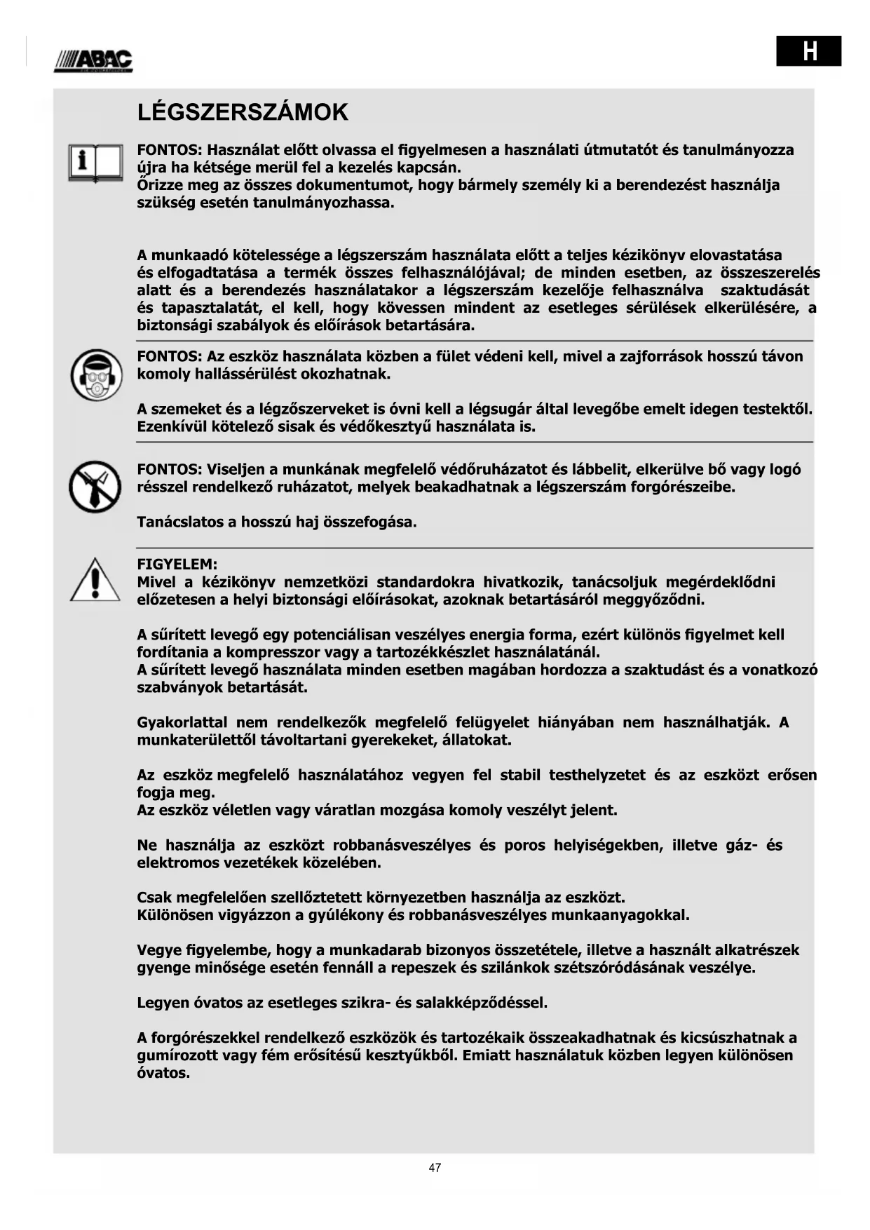 FONTOS: Használat előtt olvassa el gyelmesen a használati útmutatót és tanulmányozza újra ha kétsége merül fel a kezelés kapcsán. Őrizze meg az összes dokumentumot, hogy bármely személy ki a berendezést használja szükség esetén tanulmányozhassa. A munkaadó kötelessége a légszerszám használata előtt a teljes kézikönyv elovastatása és elfogadtatása a termék összes felhasználójával; de minden esetben, az összeszerelés alatt és a berendezés használatakor a légszerszám kezelője felhasználva szaktudását és tapasztalatát, el kell, hogy kövessen mindent az esetleges sérülések elkerülésére, a biztonsági szabályok és előírások betartására. FONTOS: Az eszköz használata közben a fület védeni kell, mivel a zajforrások hosszú távon komoly hallássérülést okozhatnak. A szemeket és a légzőszerveket is óvni kell a légsugár által levegőbe emelt idegen testektől. Ezenkívül kötelező sisak és védőkesztyű használata is. FONTOS: Viseljen a munkának megfelelő védőruházatot és lábbelit, elkerülve bő vagy logó résszel rendelkező ruházatot, melyek beakadhatnak a légszerszám forgórészeibe. Tanácslatos a hosszú haj összefogása. FIGYELEM: Mivel a kézikönyv nemzetközi standardokra hivatkozik, tanácsoljuk megérdeklődni előzetesen a helyi biztonsági előírásokat, azoknak betartásáról meggyőződni. A sűrített levegő egy potenciálisan veszélyes energia forma, ezért különös gyelmet kell fordítania a kompresszor vagy a tartozékkészlet használatánál. A sűrített levegő használata minden esetben magában hordozza a szaktudást és a vonatkozó szabványok betartását. Gyakorlattal nem rendelkezők megfelelő felügyelet hiányában nem használhatják. A munkaterülettől távoltartani gyerekeket, állatokat. Az eszköz megfelelő használatához vegyen fel stabil testhelyzetet és az eszközt erősen fogja meg. Az eszköz véletlen vagy váratlan mozgása komoly veszélyt jelent. Ne használja az eszközt robbanásveszélyes és poros helyiségekben, illetve gáz- és elektromos vezetékek közelében. Csak megfelelően szellőztetett környezetben használja az eszközt. Különösen vigyázzon a gyúlékony és robbanásveszélyes munkaanyagokkal. Vegye gyelembe, hogy a munkadarab bizonyos összetétele, illetve a használt alkatrészek gyenge minősége esetén fennáll a repeszek és szilánkok szétszóródásának veszélye. Legyen óvatos az esetleges szikra- és salakképződéssel. A forgórészekkel rendelkező eszközök és tartozékaik összeakadhatnak és kicsúszhatnak a gumírozott vagy fém erősítésű kesztyűkből. Emiatt használatuk közben legyen különösen óvatos.48
