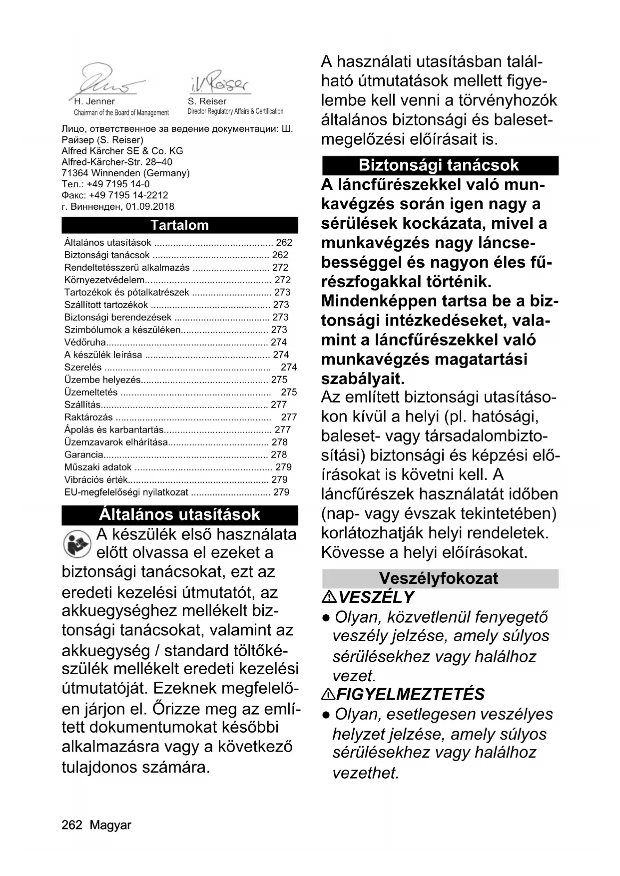 • kg 4,3262 Magyar Лицо, ответственное за ведение документации: Ш. Райзер (S. Reiser) Alfred Kärcher SE & Co. KG Alfred-Kärcher-Str. 28–40 71364 Winnenden (Germany) Тел.: +49 7195 14-0 Факс: +49 7195 14-2212 г. Винненден, 01.09.2018 Tartalom Általános utasítások A készülék első használata előtt olvassa el ezeket a biztonsági tanácsokat, ezt az eredeti kezelési útmutatót, az akkuegységhez mellékelt biz- tonsági tanácsokat, valamint az akkuegység / standard töltőké- szülék mellékelt eredeti kezelési útmutatóját. Ezeknek megfelelő- en járjon el. Őrizze meg az emlí- tett dokumentumokat későbbi alkalmazásra vagy a következő tulajdonos számára. A használati utasításban talál- ható útmutatások mellett figye- lembe kell venni a törvényhozók általános biztonsági és baleset- megelőzési előírásait is. Biztonsági tanácsok A láncfűrészekkel való mun- kavégzés során igen nagy a sérülések kockázata, mivel a munkavégzés nagy láncse- bességgel és nagyon éles fű- részfogakkal történik. Mindenképpen tartsa be a biz- tonsági intézkedéseket, vala- mint a láncfűrészekkel való munkavégzés magatartási szabályait. Az említett biztonsági utasításo- kon kívül a helyi (pl. hatósági, baleset- vagy társadalombizto- sítási) biztonsági és képzési elő- írásokat is követni kell. A láncfűrészek használatát időben (nap- vagy évszak tekintetében) korlátozhatják helyi rendeletek. Kövesse a helyi előírásokat. Veszélyfokozat VESZÉLY ● Olyan, közvetlenül fenyegető veszély jelzése, amely súlyos sérülésekhez vagy halálhoz vezet. 몇 FIGYELMEZTETÉS ● Olyan, esetlegesen veszélyes helyzet jelzése, amely súlyos sérülésekhez vagy halálhoz vezethet. Általános utasítások p. 262