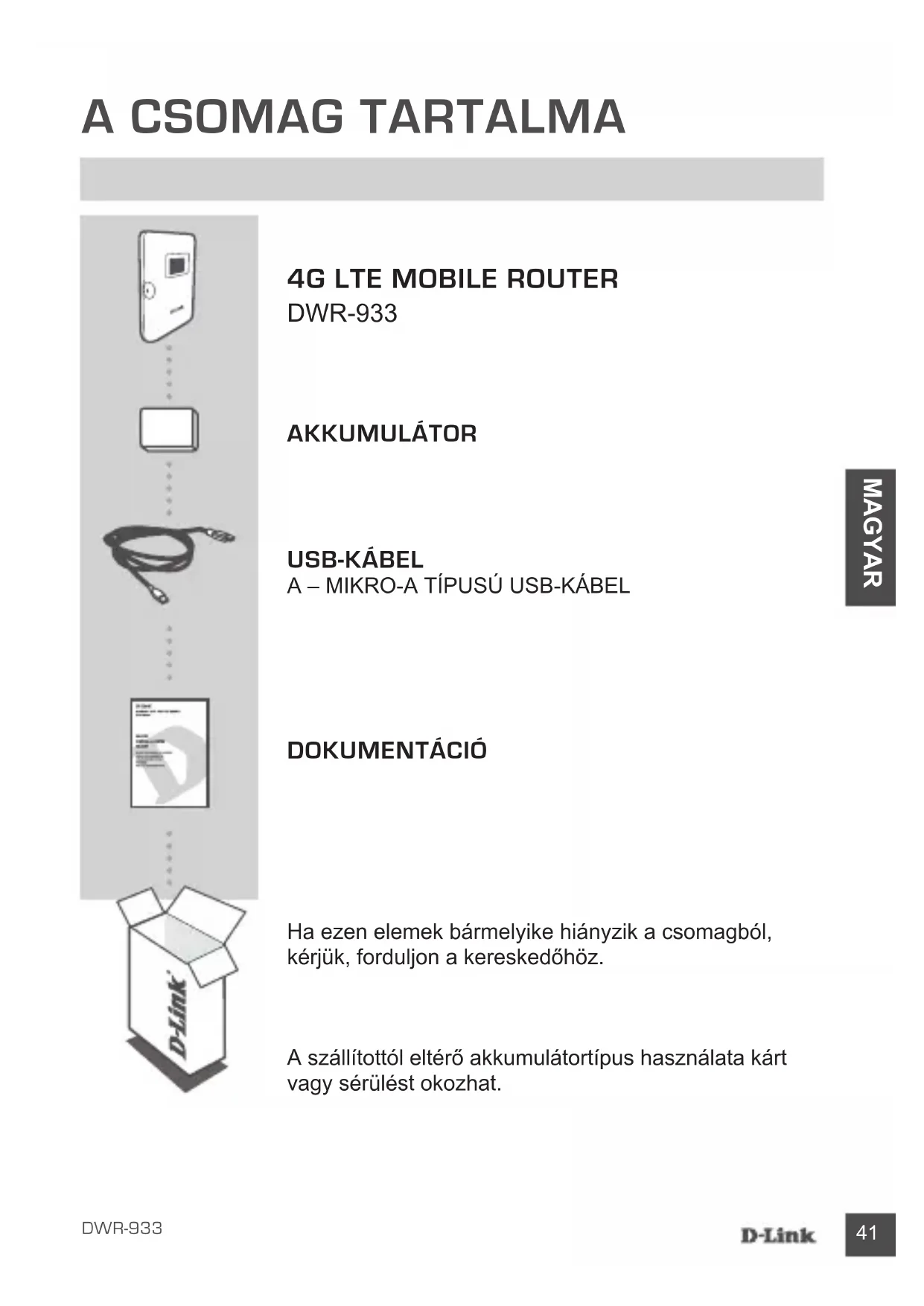 Ha ezen elemek bármelyike hiányzik a csomagból, kérjük, forduljon a kereskedőhöz. A szállítottól eltérő akkumulátortípus használata kárt vagy sérülést okozhat. DOKuMENTÁCIÓ42 DWR-933 MAGYAR TERMÉKbEÁLLÍTÁS GYoRS bEÜZEMELÉS