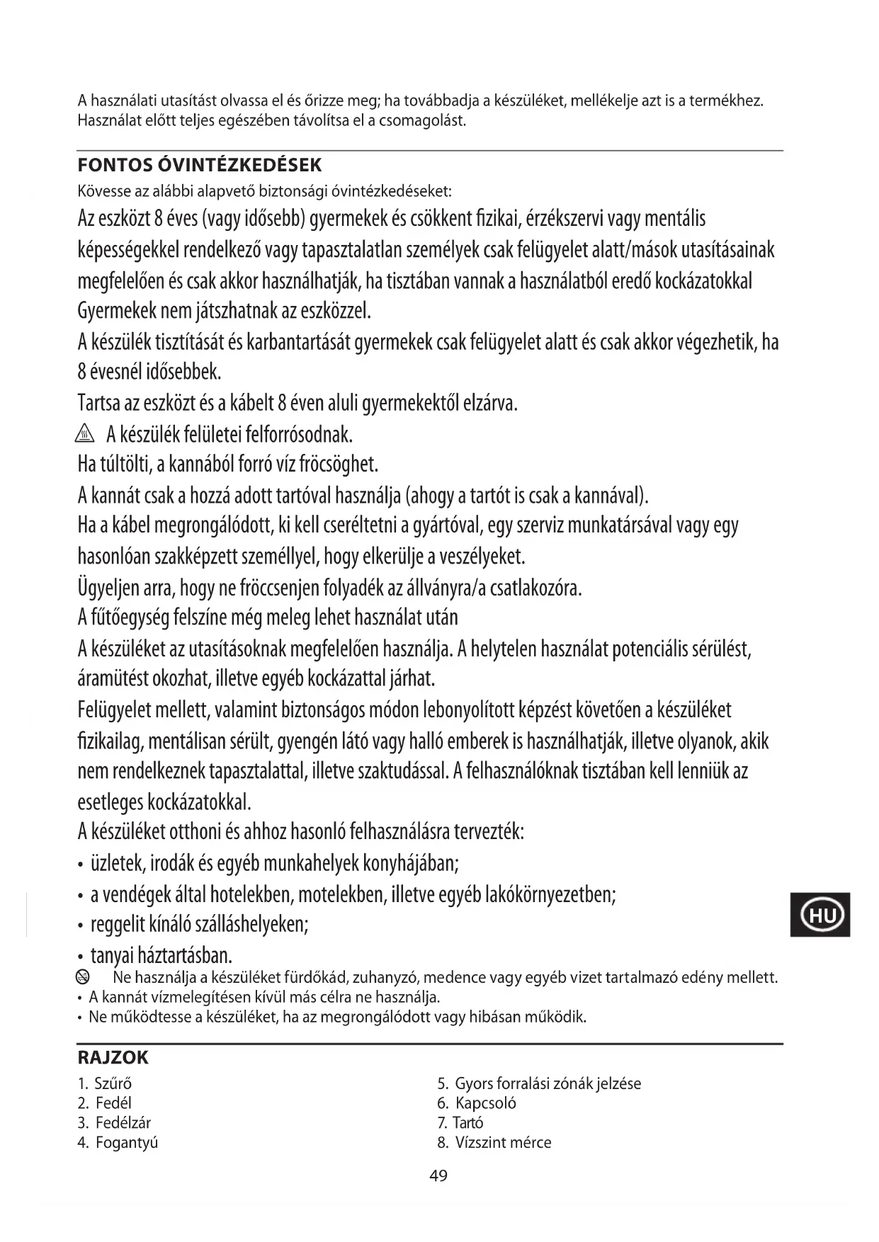 Kövesse az alábbi alapvető biztonsági óvintézkedéseket: Az eszközt 8 éves (vagy idősebb) gyermekek és csökkent zikai, érzékszervi vagy mentális képességekkel rendelkező vagy tapasztalatlan személyek csak felügyelet alatt/mások utasításainak megfelelően és csak akkor használhatják, ha tisztában vannak a használatból eredő kockázatokkal Gyermekek nem játszhatnak az eszközzel. A készülék tisztítását és karbantartását gyermekek csak felügyelet alatt és csak akkor végezhetik, ha 8 évesnél idősebbek. Tartsa az eszközt és a kábelt 8 éven aluli gyermekektől elzárva. h A készülék felületei felforrósodnak. Ha túltölti, a kannából forró víz fröcsöghet. A kannát csak a hozzá adott tartóval használja (ahogy a tartót is csak a kannával). Ha a kábel megrongálódott, ki kell cseréltetni a gyártóval, egy szerviz munkatársával vagy egy hasonlóan szakképzett személlyel, hogy elkerülje a veszélyeket. Ügyeljen arra, hogy ne fröccsenjen folyadék az állványra/a csatlakozóra. A fűtőegység felszíne még meleg lehet használat után A készüléket az utasításoknak megfelelően használja. A helytelen használat potenciális sérülést, áramütést okozhat, illetve egyéb kockázattal járhat. Felügyelet mellett, valamint biztonságos módon lebonyolított képzést követően a készüléket zikailag, mentálisan sérült, gyengén látó vagy halló emberek is használhatják, illetve olyanok, akik nem rendelkeznek tapasztalattal, illetve szaktudással. A felhasználóknak tisztában kell lenniük az esetleges kockázatokkal. A készüléket otthoni és ahhoz hasonló felhasználásra tervezték: