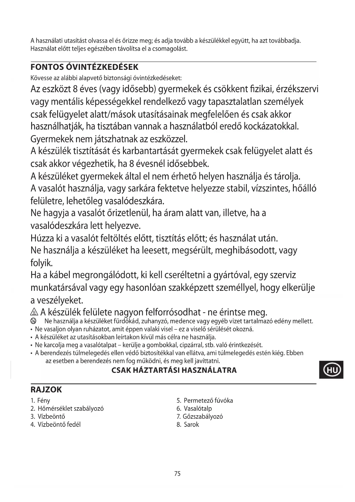 Kövesse az alábbi alapvető biztonsági óvintézkedéseket: Az eszközt 8 éves (vagy idősebb) gyermekek és csökkent zikai, érzékszervi vagy mentális képességekkel rendelkező vagy tapasztalatlan személyek csak felügyelet alatt/mások utasításainak megfelelően és csak akkor használhatják, ha tisztában vannak a használatból eredő kockázatokkal. Gyermekek nem játszhatnak az eszközzel. A készülék tisztítását és karbantartását gyermekek csak felügyelet alatt és csak akkor végezhetik, ha 8 évesnél idősebbek. A készüléket gyermekek által el nem érhető helyen használja és tárolja. A vasalót használja, vagy sarkára fektetve helyezze stabil, vízszintes, hőálló felületre, lehetőleg vasalódeszkára. Ne hagyja a vasalót őrizetlenül, ha áram alatt van, illetve, ha a vasalódeszkára lett helyezve. Húzza ki a vasalót feltöltés előtt, tisztítás előtt; és használat után. Ne használja a készüléket ha leesett, megsérült, meghibásodott, vagy folyik. Ha a kábel megrongálódott, ki kell cseréltetni a gyártóval, egy szerviz munkatársával vagy egy hasonlóan szakképzett személlyel, hogy elkerülje a veszélyeket. h A készülék felülete nagyon felforrósodhat - ne érintse meg. b Ne használja a készüléket fürdőkád, zuhanyzó, medence vagy egyéb vizet tartalmazó edény mellett.