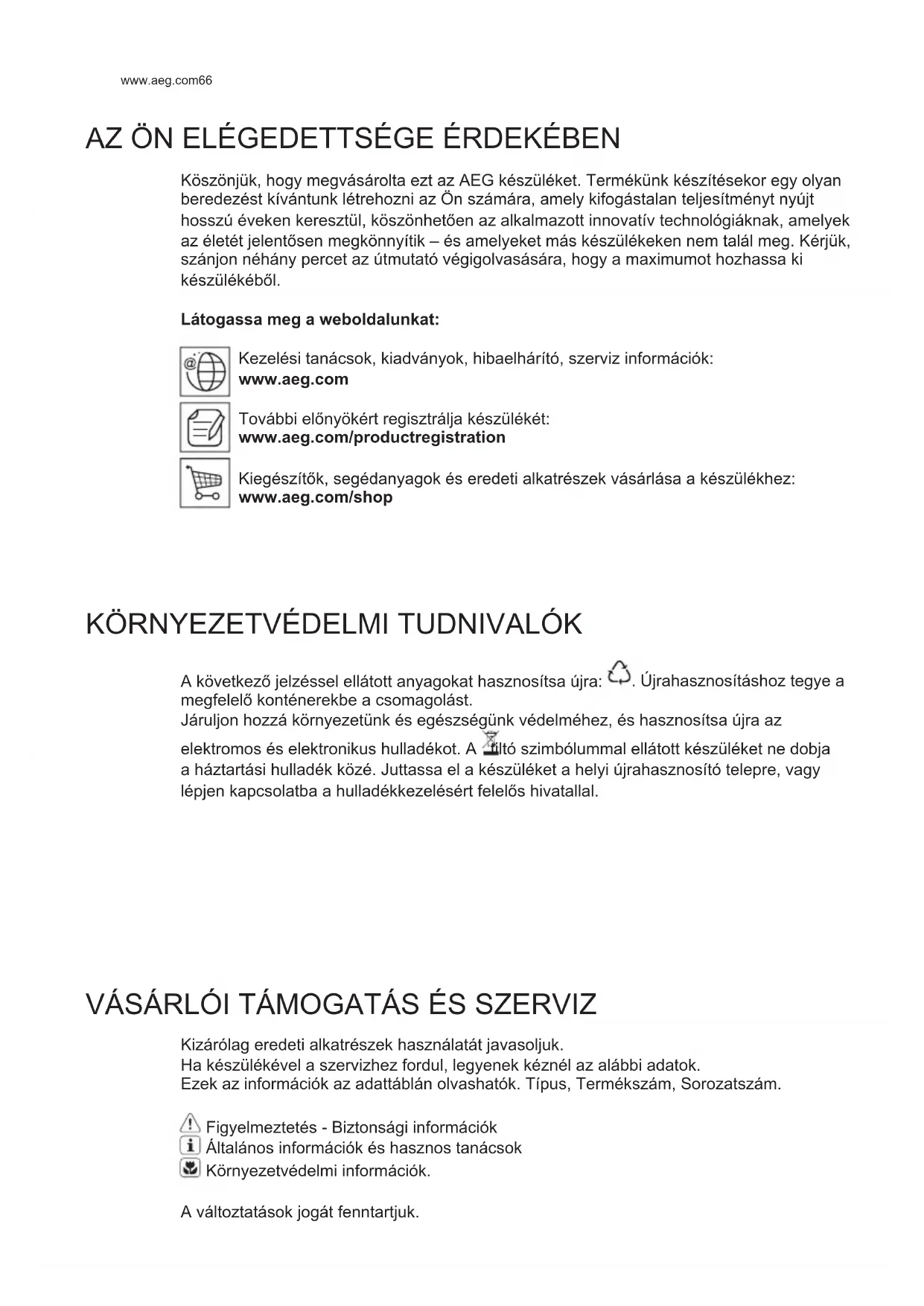 A következĪ jelzéssel ellátott anyagokat hasznosítsa újra: . Újrahasznosításhoz tegye a megfelelĪ konténerekbe a csomagolást. Járuljon hozzá környezetünk és egészségünk védelméhez, és hasznosítsa újra az elektromos és elektronikus hulladékot. A tiltó szimbólummal ellátott készüléket ne dobja a háztartási hulladék közé. Juttassa el a készüléket a helyi újrahasznosító telepre, vagy lépjen kapcsolatba a hulladékkezelésért felelĪs hivatallal. VÁSÁRLÓI TÁMOGATÁS ÉS SZERVIZ Kizárólag eredeti alkatrészek használatát javasoljuk. Ha készülékével a szervizhez fordul, legyenek kéznél az alábbi adatok. Ezek az információk az adattáblán olvashatók. Típus, Termékszám, Sorozatszám. Figyelmeztetés - Biztonsági információk Általános információk és hasznos tanácsok Környezetvédelmi információk. A változtatások jogát fenntartjuk.