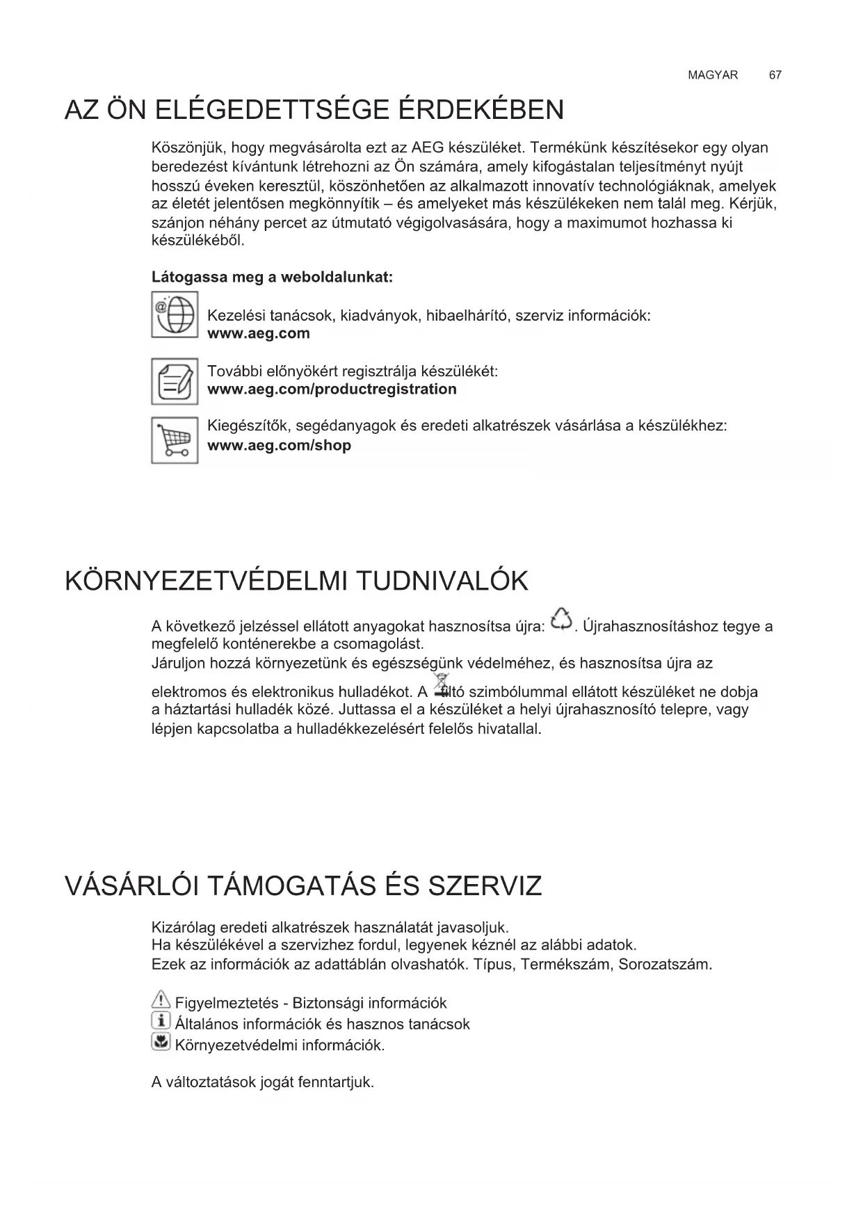 A következĪ jelzéssel ellátott anyagokat hasznosítsa újra: . Újrahasznosításhoz tegye a megfelelĪ konténerekbe a csomagolást. Járuljon hozzá környezetünk és egészségünk védelméhez, és hasznosítsa újra az elektromos és elektronikus hulladékot. A tiltó szimbólummal ellátott készüléket ne dobja a háztartási hulladék közé. Juttassa el a készüléket a helyi újrahasznosító telepre, vagy lépjen kapcsolatba a hulladékkezelésért felelĪs hivatallal. VÁSÁRLÓI TÁMOGATÁS ÉS SZERVIZ Kizárólag eredeti alkatrészek használatát javasoljuk. Ha készülékével a szervizhez fordul, legyenek kéznél az alábbi adatok. Ezek az információk az adattáblán olvashatók. Típus, Termékszám, Sorozatszám. Figyelmeztetés - Biztonsági információk Általános információk és hasznos tanácsok Környezetvédelmi információk. A változtatások jogát fenntartjuk.