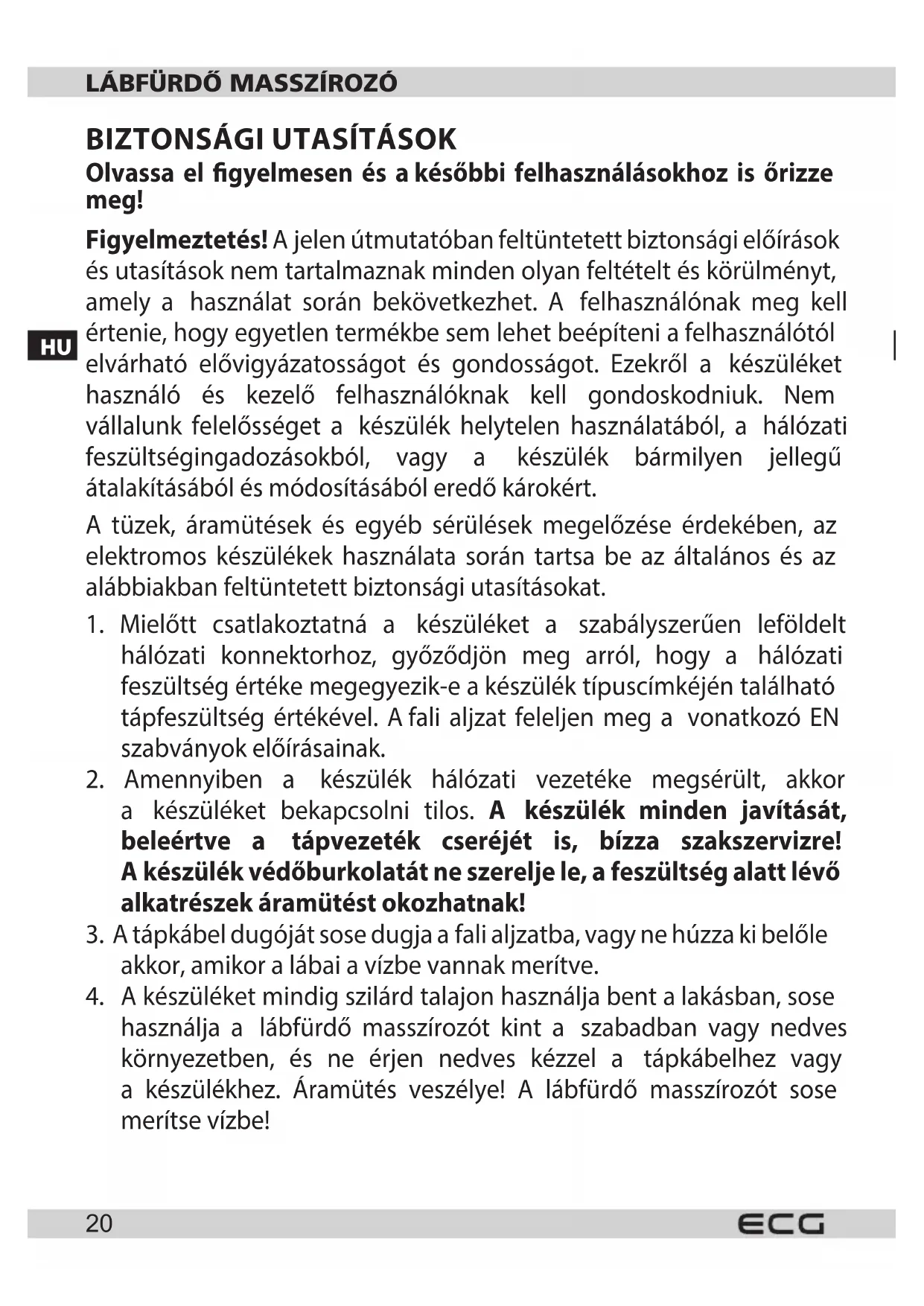 HULLADÉKFELHASZNÁLÁS ÉS MEGSEMMISÍTÉS A csomagolópapírt és hullámpapírt adja le hulladékgyűjtő telepen. Csomagolófólia, PE zacskók, műanyag alkatrészek – műanyaggyűjtő szelektív hulladéktároló edénybe. ÉLETTARTAM LEJÁRTÁT KÖVETŐ MEGSEMMISÍTÉS Használt elektromos és elektronikus készülékek megsemmisítése (érvényes az EU tagállamokban és számos szelektív hulladékgyűjtést végző európai országban) Ez a terméken vagy csomagolásán található jelzés azt mutatja, hogy a terméket tilos standard háztartási hulladékként megsemmisíteni. A terméket elektromos és elektronikus berendezések újrahasznosítására szakosodott hulladékgyűjtő telepen adja le. A termék helyes megsemmisítésével megelőzi, hogy káros hatást fejtsen ki az emberi egészségre és környezetünkre. Az anyagok újrahasznosítása kíméli a természetes forrásainkat. A termék újrahasznosításával kapcsolatosan bővebb információkat a helyi önkormányzattól, aháztartási hulladékot feldolgozó szervezettől, vagy a termék forgalmazójától kérhet. Ez a termék megfelel a kisfeszültségű berendezések biztonságára és az elektromágneses kompatibilitásra vonatkozó EU irányelveknek. A készülék használati útmutatója a www.ecg-electro.eu oldalon található. A szöveg és a műszaki paraméterek megváltoztatásának a joga fenntartva. 08/05DE FUSSMASSAGEGERÄT