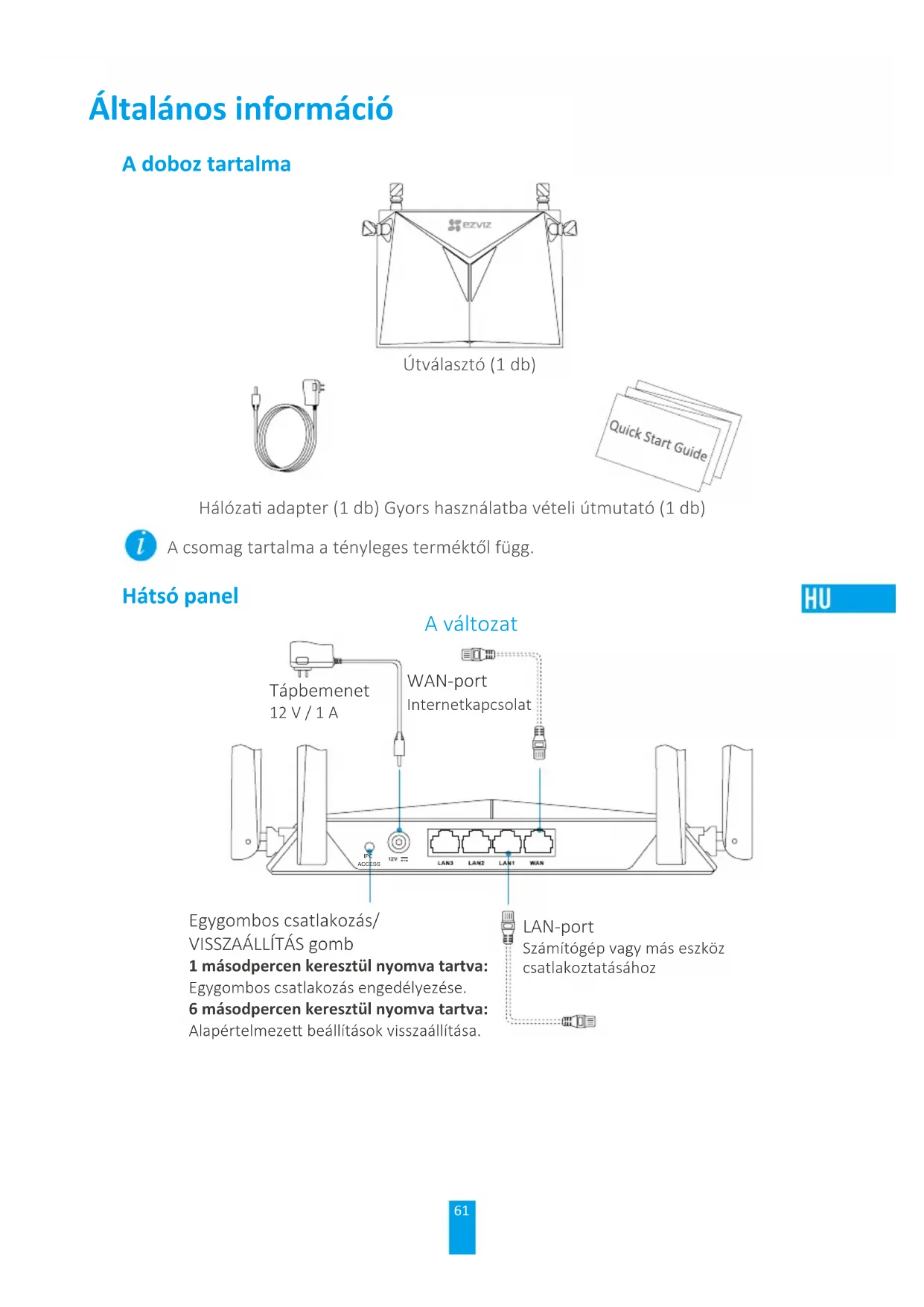 1 secundă pentru a conecta reţeaua WiFi.61 Általános információ A doboz tartalma Útválasztó (1 db) Hálóza adapter (1 db) Gyors használatba vételi útmutató (1 db) A csomag tartalma a tényleges terméktől függ. Hátsó panel A változat IPC ACCESS Tápbemenet 12 V / 1 A Egygombos csatlakozás/ VISSZAÁLLÍTÁS gomb 1 másodpercen keresztül nyomva tartva: Egygombos csatlakozás engedélyezése. 6 másodpercen keresztül nyomva tartva: Alapértelmeze beállítások visszaállítása. WAN-port Internetkapcsolat LAN-port Számítógép vagy más eszköz csatlakoztatásához62 B változat WAN-port Internetkapcsolat Tápbemenet 12 V / 1,5 A LAN-port Számítógép vagy más eszköz csatlakoztatásához Egygombos csatlakozás/ VISSZAÁLLÍTÁS gomb 1 másodpercen keresztül nyomva tartva: Egygombos csatlakozás engedélyezése 6 másodpercen keresztül nyomva tartva: Alapértelmeze beállítások visszaállítása Tápellátás be/ki *USB-csatlakozó USB-lemezmeghajtó, vagy mobil HDD-meghajtó stb. számára.