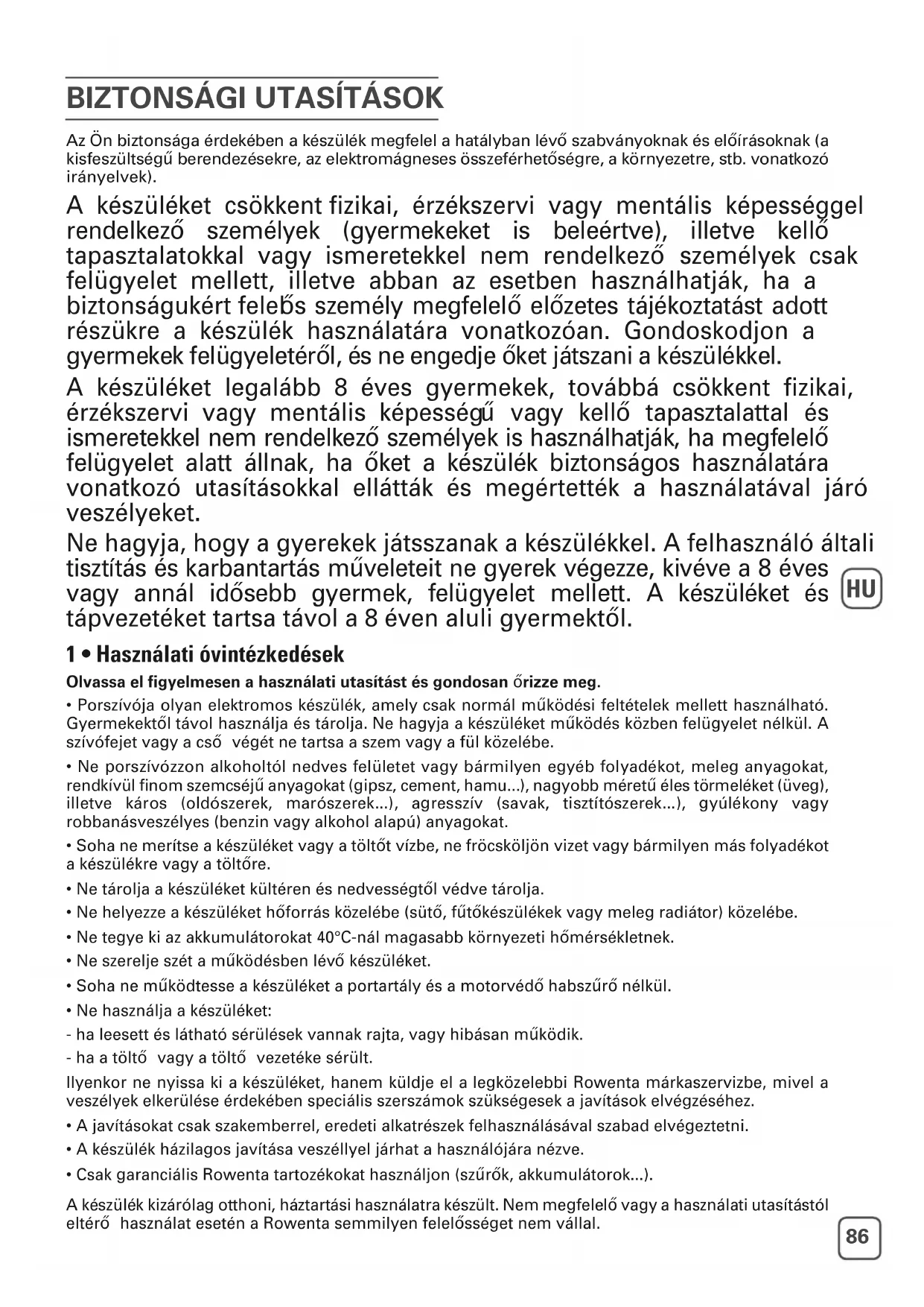 Az Ön biztonsága érdekében a készülék megfelel a hatályban lévő szabványoknak és előírásoknak (a kisfeszültségű berendezésekre, az elektromágneses összeférhetőségre, a környezetre, stb. vonatkozó irányelvek). A készüléket csökkent fizikai, érzékszervi vagy mentális képességgel rendelkező személyek (gyermekeket is beleértve), illetve kellő tapasztalatokkal vagy ismeretekkel nem rendelkező személyek csak felügyelet mellett, illetve abban az esetben használhatják, ha a biztonságukért felel ős személy megfelelő előzetes tájékoztatást adott részükre a készülék használatára vonatkozóan. Gondoskodjon a gyermekek felügyeletéről, és ne engedje őket játszani a készülékkel. A készüléket legalább 8 éves gyermekek, továbbá csökkent fizikai, érzékszervi vagy mentális képesség ű vagy kellő tapasztalattal és ismeretekkel nem rendelkező személyek is használhatják, ha megfelelő felügyelet alatt állnak, ha őket a készülék biztonságos használatára vonatkozó utasításokkal ellátták és megértették a használatával járó veszélyeket. Ne hagyja, hogy a gyerekek játsszanak a készülékkel. A felhasználó általi tisztítás és karbantartás műveleteit ne gyerek végezze, kivéve a 8 éves vagy annál idősebb gyermek, felügyelet mellett. A készüléket és tápvezetéket tartsa távol a 8 éven aluli gyermektől. 1 • Használati óvintézkedések Olvassa el figyelmesen a használati utasítást és gondosan őrizze meg.