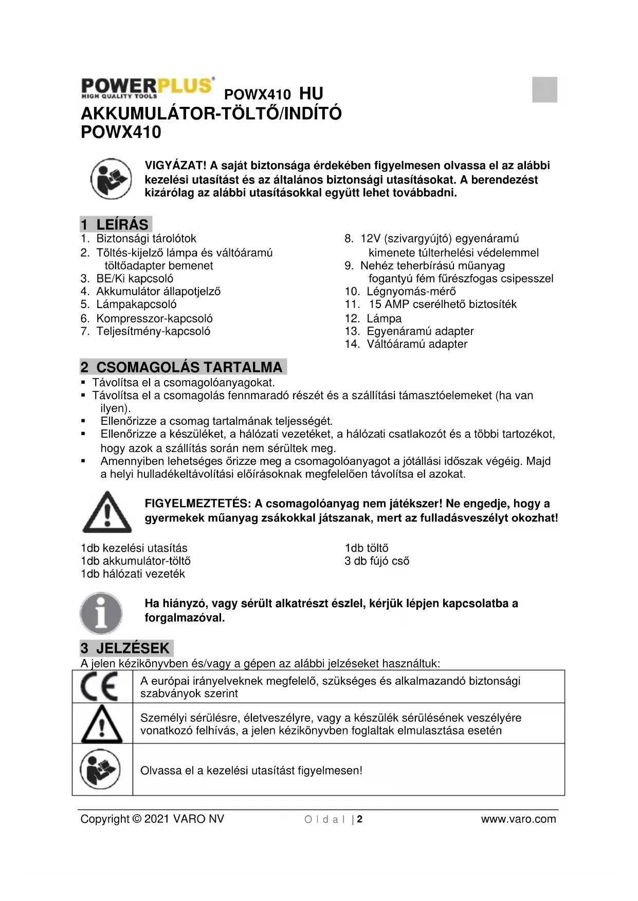 Olvassa el a kezelési utasítást figyelmesen!POWX410 HU Copyright © 2021 VARO NV O l d a l | 3 www.varo.com