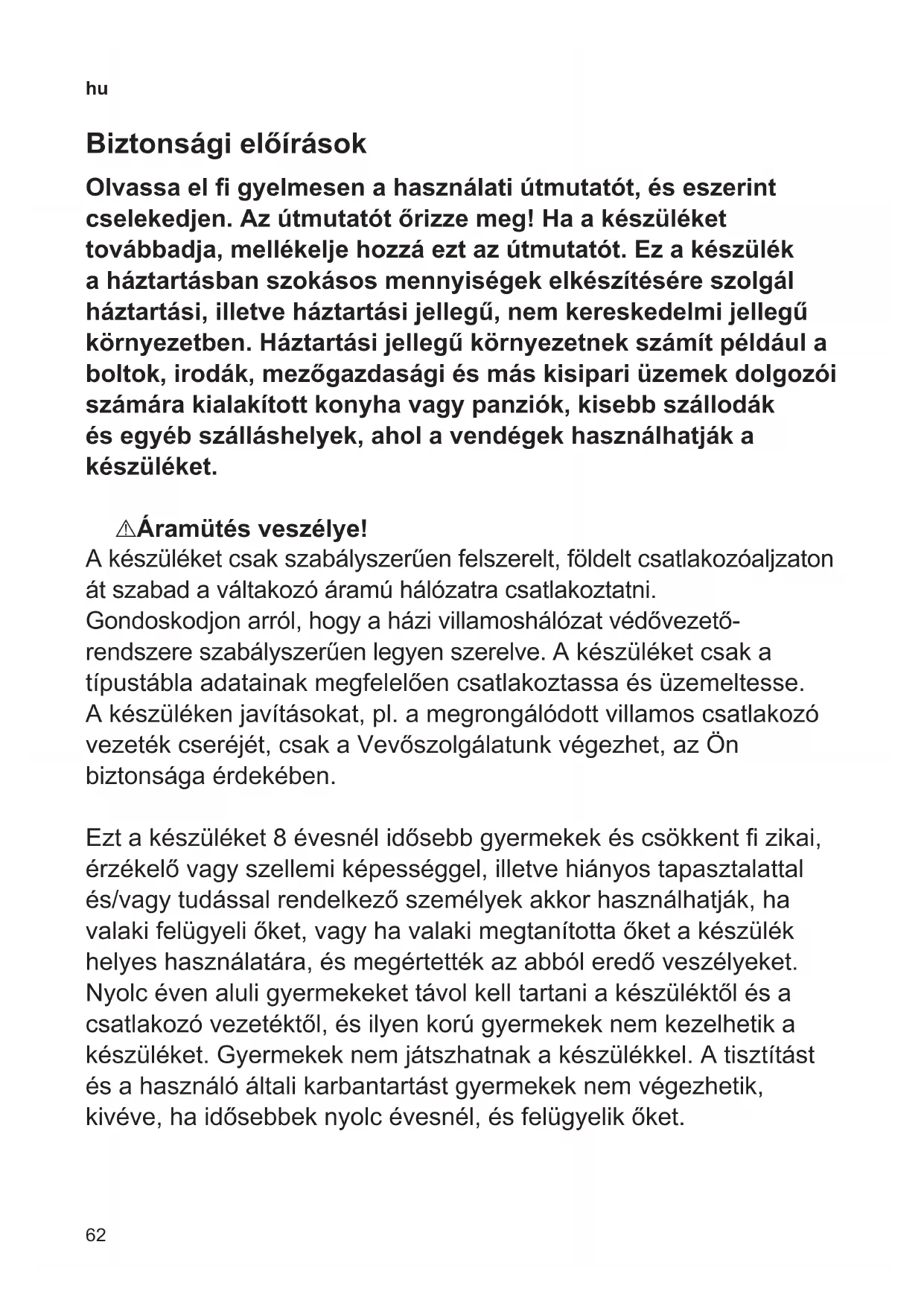 Biztonságielőírások Olvassaelgyelmesenahasználatiútmutatót,éseszerint cselekedjen.Azútmutatótőrizzemeg!Haakészüléket továbbadja,mellékeljehozzáeztazútmutatót.Ezakészülék aháztartásbanszokásosmennyiségekelkészítéséreszolgál háztartási,illetveháztartásijellegű,nemkereskedelmijellegű környezetben.Háztartásijellegűkörnyezetnekszámítpéldáula boltok,irodák,mezőgazdaságiésmáskisipariüzemekdolgozói számárakialakítottkonyhavagypanziók,kisebbszállodák és egyéb szálláshelyek, ahol a vendégek használhatják a készüléket. ¡ Áramütés veszélye! A készüléket csak szabályszerűen felszerelt, földelt csatlakozóaljzaton át szabad a váltakozó áramú hálózatra csatlakoztatni. Gondoskodjon arról, hogy a házi villamoshálózat védővezető rendszere szabályszerűen legyen szerelve. A készüléket csak a típustábla adatainak megfelelően csatlakoztassa és üzemeltesse. A készüléken javításokat, pl. a megrongálódott villamos csatlakozó vezeték cseréjét, csak a Vevőszolgálatunk végezhet, az Ön biztonsága érdekében. Ezt a készüléket 8 évesnél idősebb gyermekek és csökkent zikai, érzékelő vagy szellemi képességgel, illetve hiányos tapasztalattal és/vagy tudással rendelkező személyek akkor használhatják, ha valaki felügyeli őket, vagy ha valaki megtanította őket a készülék helyes használatára, és megértették az abból eredő veszélyeket. Nyolc éven aluli gyermekeket távol kell tartani a készüléktől és a csatlakozó vezetéktől, és ilyen korú gyermekek nem kezelhetik a készüléket. Gyermekek nem játszhatnak a készülékkel. A tisztítást és a használó általi karbantartást gyermekek nem végezhetik, kivéve, ha idősebbek nyolc évesnél, és felügyelik őket.63