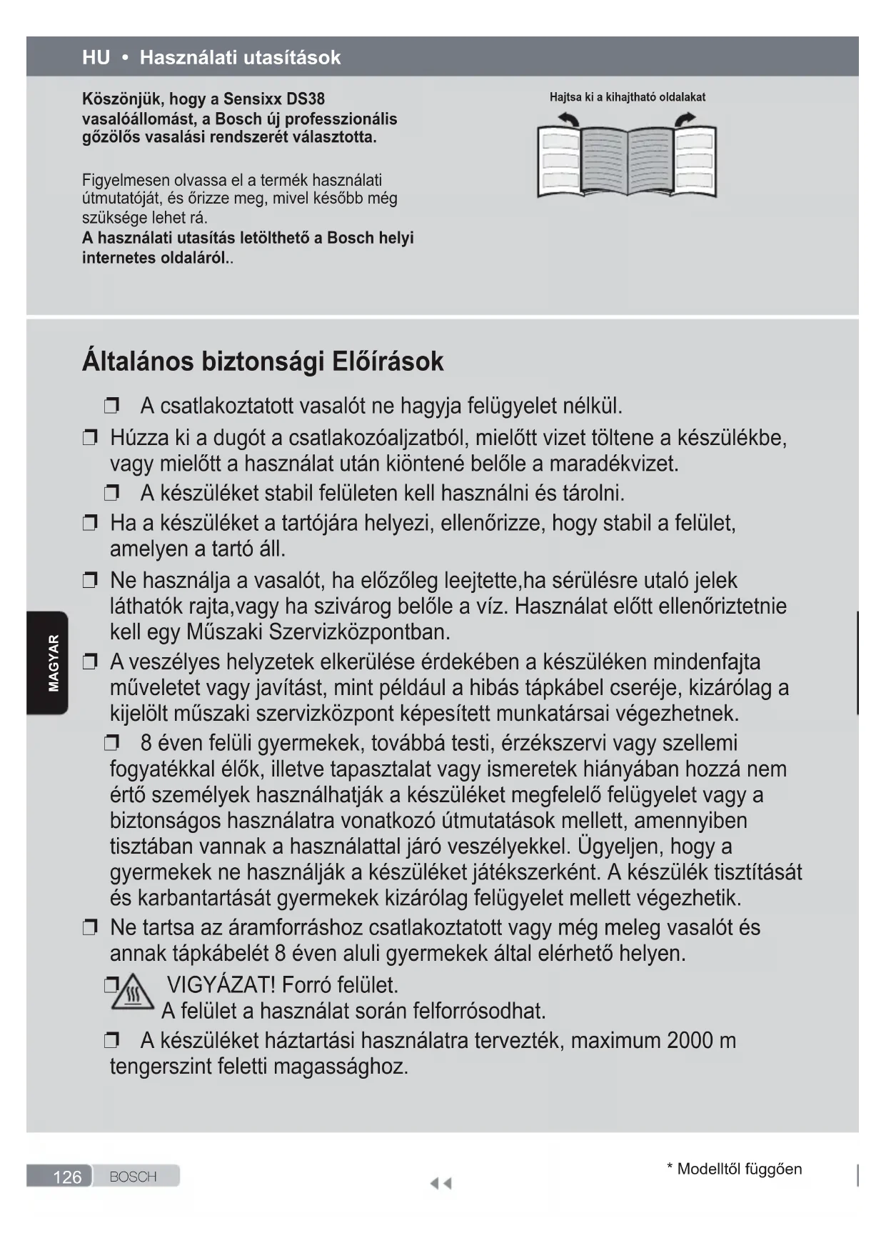 żelazko od razu przestanie uwalniać parę. Jeżeli problem, który wystąpił, nie jest opisany w powyższej tabeli, należy skontaktować się z autoryzowanym serwisem technicznym.126 B O S C H* Modelltől függőenmagYar Köszönjük, hogy a Sensixx DS38 vasalóállomást, a Bosch új professzionális gőzölős vasalási rendszerét választotta. Figyelmesen olvassa el a termék használati útmutatóját, és őrizze meg, mivel később még szüksége lehet rá. A használati utasítás letölthető a Bosch helyi internetes oldaláról.. HU • Használati utasítások Hajtsa ki a kihajtható oldalakat Általános biztonsági Előírások ❐ A csatlakoztatott vasalót ne hagyja felügyelet nélkül. ❐ Húzza ki a dugót a csatlakozóaljzatból, mielőtt vizet töltene a készülékbe, vagy mielőtt a használat után kiöntené belőle a maradékvizet. ❐ A készüléket stabil felületen kell használni és tárolni. ❐ Ha a készüléket a tartójára helyezi, ellenőrizze, hogy stabil a felület, amelyen a tartó áll. ❐ Ne használja a vasalót, ha előzőleg leejtette,ha sérülésre utaló jelek láthatók rajta,vagy ha szivárog belőle a víz. Használat előtt ellenőriztetnie kell egy Műszaki Szervizközpontban. ❐ A veszélyes helyzetek elkerülése érdekében a készüléken mindenfajta műveletet vagy javítást, mint például a hibás tápkábel cseréje, kizárólag a kijelölt műszaki szervizközpont képesített munkatársai végezhetnek. ❐ 8 éven felüli gyermekek, továbbá testi, érzékszervi vagy szellemi fogyatékkal élők, illetve tapasztalat vagy ismeretek hiányában hozzá nem értő személyek használhatják a készüléket megfelelő felügyelet vagy a biztonságos használatra vonatkozó útmutatások mellett, amennyiben tisztában vannak a használattal járó veszélyekkel. Ügyeljen, hogy a gyermekek ne használják a készüléket játékszerként. A készülék tisztítását és karbantartását gyermekek kizárólag felügyelet mellett végezhetik. ❐ Ne tartsa az áramforráshoz csatlakoztatott vagy még meleg vasalót és annak tápkábelét 8 éven aluli gyermekek által elérhető helyen.
