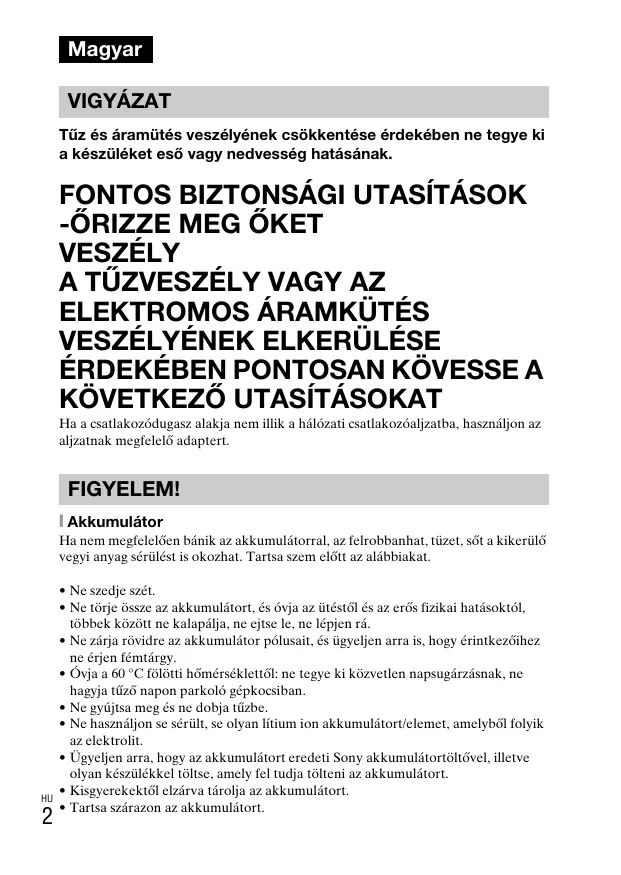 Szerzői jogokra vonatkozó figyelmeztetés Televíziós műsorok, filmek, videoszalagok és egyéb anyagok szerzői jog által védettek lehetnek. Ilyen anyagok engedély nélküli felvétele a vonatkozó jogszabályokba ütközhet. A felvételek sérüléséért, illetve a felvételi hibákért nem vállalunk felelősséget A Sony nem vállalja a felvétel tartalmának ellentételezését, ha a felvétel vagy a lejátszás elmaradása a készülék vagy az adathordozó, stb. hibájából következik be. A fényképezőgép felületének tisztítása A fényképezőgép burkolatát puha, vízzel enyhén benedvesített ruhadarabbal tisztítsa, majd törölje meg egy száraz ruhadarabbal. Hogy megelőzze a külső felület vagy burkolat károsodását: – Ne tegye ki a fényképezőgépet vegyszerek, pl. hígító, benzin, alkohol, eldobható törlőkendő, rovarriasztó, napolaj vagy rovarölő szer hatásának.