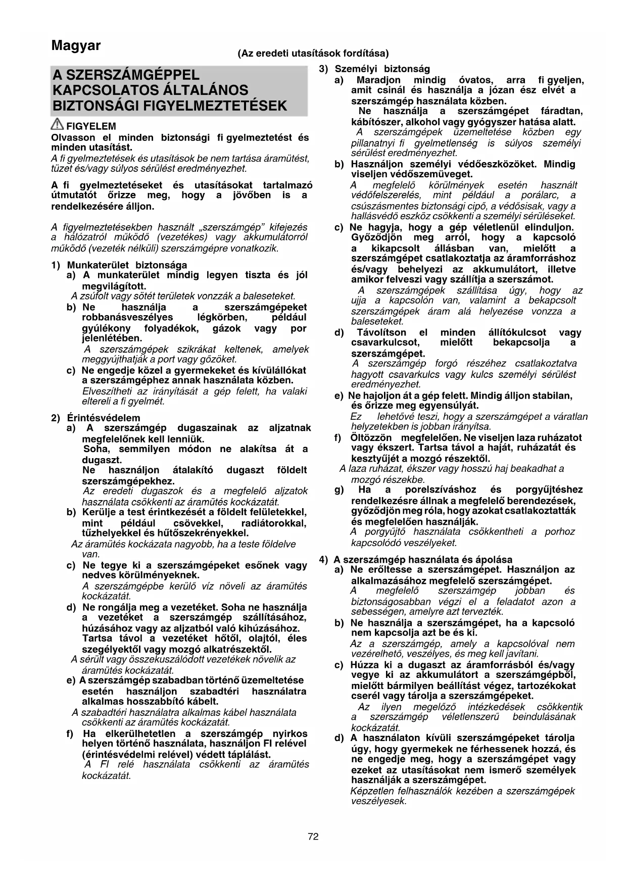 FIGYELEM Olvasson el minden biztonsági fi gyelmeztetést és minden utasítást. A fi gyelmeztetések és utasítások be nem tartása áramütést, tüzet és/vagy súlyos sérülést eredményezhet. A fi gyelmeztetéseket és utasításokat tartalmazó útmutatót őrizze meg, hogy a jövőben is a rendelkezésére álljon. A fi gyelmeztetésekben használt „szerszámgép” kifejezés a hálózatról működő (vezetékes) vagy akkumulátorról működő (vezeték nélküli) szerszámgépre vonatkozik.