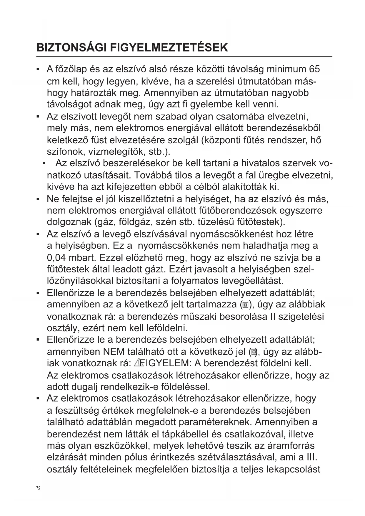 - Az elszívó beszerelésekor be kell tartani a hivatalos szervek vo- natkozó utasításait. Továbbá tilos a levegőt a fal üregbe elvezetni, kivéve ha azt kifejezetten ebből a célból alakították ki.