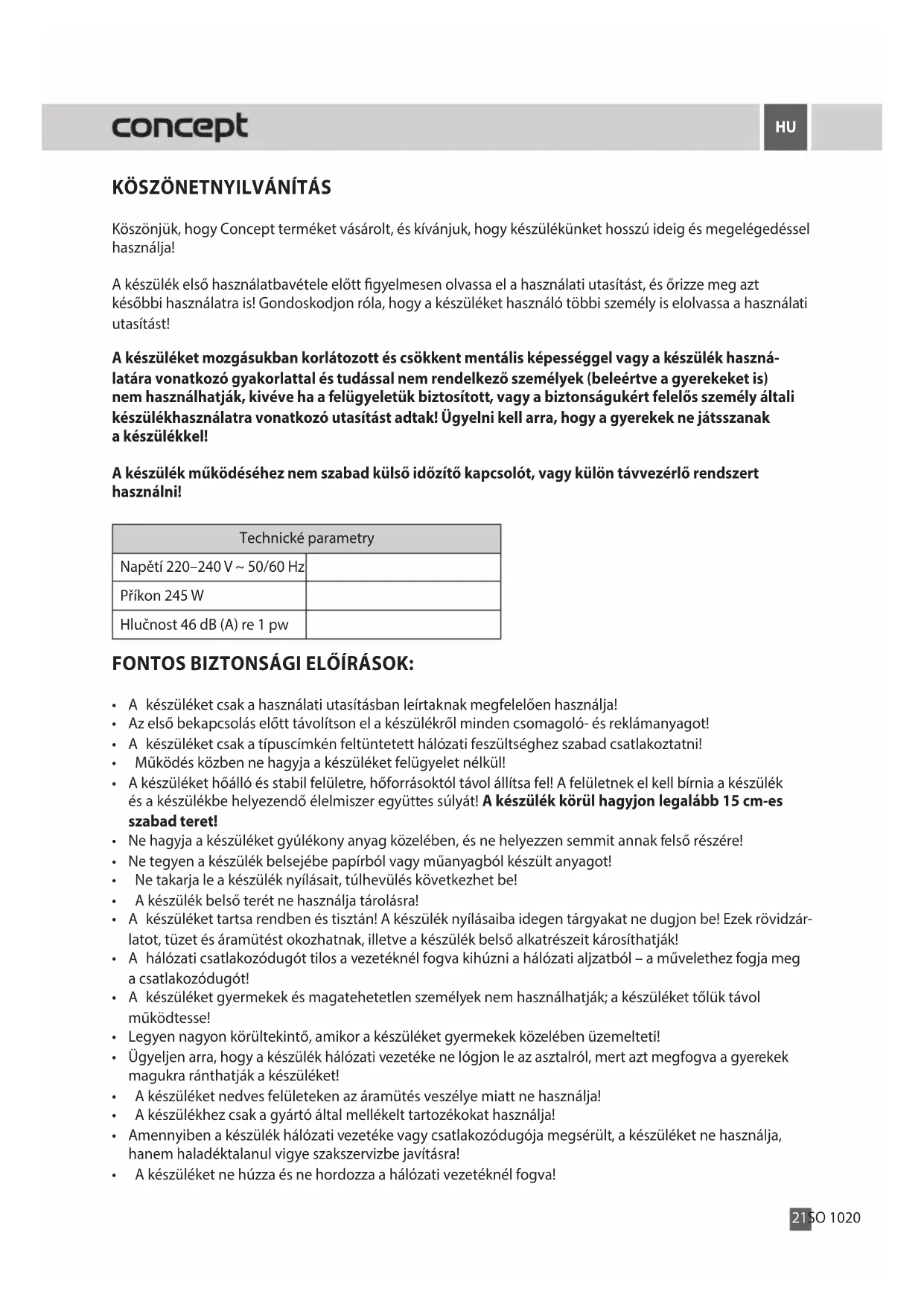 Köszönjük, hogy Concept terméket vásárolt, és kívánjuk, hogy készülékünket hosszú ideig és megelégedéssel használja! A készülék első használatbavétele előtt gyelmesen olvassa el a használati utasítást, és őrizze meg azt későbbi használatra is! Gondoskodjon róla, hogy a készüléket használó többi személy is elolvassa a használati utasítást! A készüléket mozgásukban korlátozott és csökkent mentális képességgel vagy a készülék haszná- latára vonatkozó gyakorlattal és tudással nem rendelkező személyek (beleértve a gyerekeket is) nem használhatják, kivéve ha a felügyeletük biztosított, vagy a biztonságukért felelős személy általi készülékhasználatra vonatkozó utasítást adtak! Ügyelni kell arra, hogy a gyerekek ne játsszanak a készülékkel! A készülék működéséhez nem szabad külső időzítő kapcsolót, vagy külön távvezérlő rendszert használni! Technické parametry Napětí 220–240 V ~ 50/60 Hz Příkon 245 W Hlučnost 46 dB (A) re 1 pw FONTOS BIZTONSÁGI ELŐÍRÁSOK: