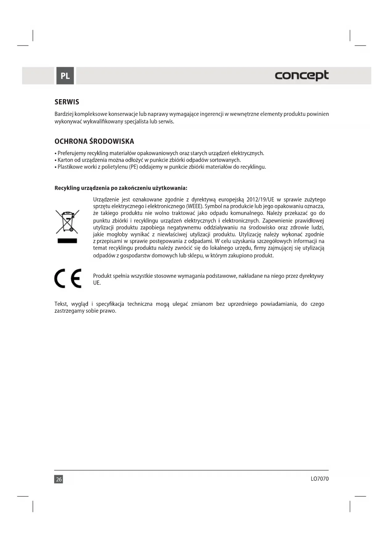 A garanciális javítás keretében kicserélt hibás pótalkatrészekre a fogyasztó nem tarthat igényt. Amennyiben a fogyasztó eláll az adásvételi szerződéstől, úgy köteles visszaszolgáltatni a komplett terméket beleértve annak tartozékait, valamint a termékkel leszállított dokumentumokat is. A termékkel együtt adott ajándékokra, amelyek nem kerültek kiszámlázásra a fogyasztónak, semmilyen jótállás nem vonatkozik. Megjegyzés: A szállítás során megsérült termék reklamációjára a szállítmányozó reklamációs szabályzata vonatkozik. Gyártó Jindřich Valenta – Concept Vysokomýtská 1800, 565 01 Choceň Cseh Köztársaság tel: +420465471400 fax: +420 465 473 304 email: servis@my-concept.cz www: www.my-concept.com99 LO7070 LO7070 A garanciális javítás keretében kicserélt hibás pótalkatrészekre a fogyasztó nem tarthat igényt. Amennyiben a fogyasztó eláll az adásvételi szerződéstől, úgy köteles visszaszolgáltatni a komplett terméket beleértve annak tartozékait, valamint a termékkel leszállított dokumentumokat is. A termékkel együtt adott ajándékokra, amelyek nem kerültek kiszámlázásra a fogyasztónak, semmilyen jótállás nem vonatkozik. Megjegyzés: A szállítás során megsérült termék reklamációjára a szállítmányozó reklamációs szabályzata vonatkozik. Gyártó Jindřich Valenta – Concept Vysokomýtská 1800, 565 01 Choceň Cseh Köztársaság tel: +420465471400 fax: +420 465 473 304 email: servis@my-concept.cz www: www.my-concept.com100 LO7070 GARANTIJAS TALONS Pārdevēja pienākums ir iepazīstināt patērētāju ar izstrādājuma parametriem un darbību, kā arī pilnībā un salasāmi aizpildīt garantijas talonu izstrādājuma pārdošanas dienā. Ja nav pareizi aizpildīta vai nepareizi norādīta nepieciešamā informācija par izstrādājumu, garantijas talons ir nederīgs! Ražotājs (vai piegādātājs) garantijas laika periodā ir atbildīgs par izstrādājuma tehniskajām īpašībām un tā darbību, ko paredz attiecīgās tehniskās normas un nosacījumi. Garantijas laiks ilgst 24 mēnešus, sākot no pārdošanas datuma, ja ražotājs (vai piegādātājs) nav noteicis citādi. Patērētājam garantijas ietvaros ir tiesības uz bezmaksas, savlaicīgu un pilnīgu izstrādājuma bojājumu novēršanu (skat. tālāk) vai, ja tas nav neadekvāti attiecībā pret bojājuma raksturu, tiesības uz izstrādājuma bojāto detaļu maiņu. Tiesības uz izstrādājuma maiņu vai pirkšanas līguma nosacījumu neievērošanu var izmantot tikai tad, ja ir izpildīti visi likumīgie nosacījumi, un tikai gadījumā, ja izstrādājums nav ticis pārmērīgi nolietots vai bojāts. Garantija ir spēkā, ja ir izpildīti šādi nosacījumi: