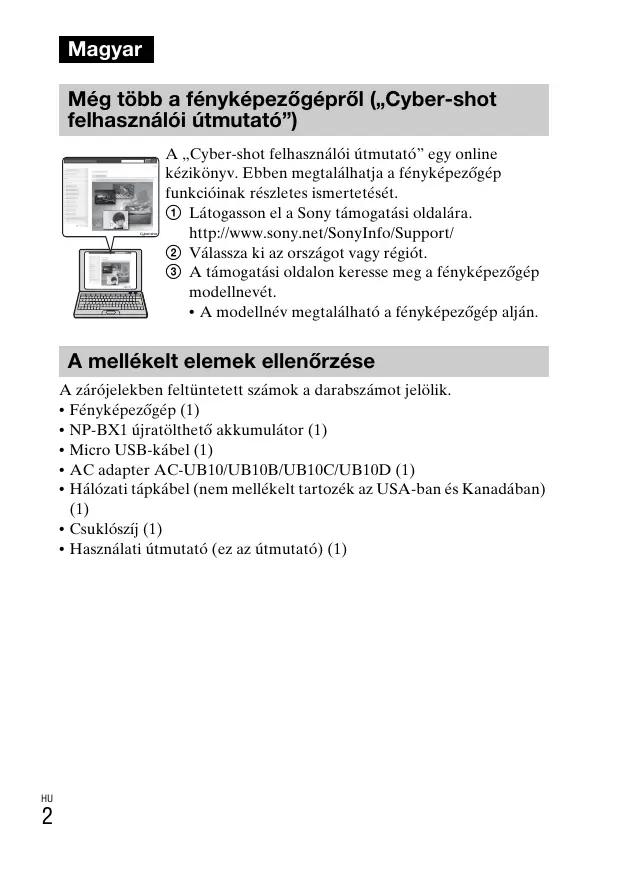 Magyar Még több a fényképezőgépről („Cyber-shot felhasználói útmutató”) A „Cyber-shot felhasználói útmutató” egy online kézikönyv. Ebben megtalálhatja a fényképezőgép funkcióinak részletes ismertetését. 1 Látogasson el a Sony támogatási oldalára. http://www.sony.net/SonyInfo/Support/ 2 Válassza ki az országot vagy régiót. 3 A támogatási oldalon keresse meg a fényképezőgép modellnevét.