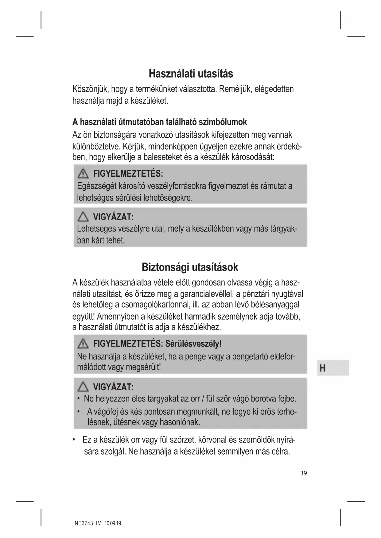 - Nie wolno wyrzucać urządzenia wraz z odpadami go- spodarstwa domowego pod koniec jego przydatności do użycia. Należy przekazać je do ocjalnego punktu zbiórki w celu recyklingu. Dzięki takiemu działaniu pomagasz chronić środowisko.39 NE3743_IM 10.09.19 Használati utasítás Köszönjük, hogy a termékünket választotta. Reméljük, elégedetten használja majd a készüléket. A használati útmutatóban található szimbólumok Az ön biztonságára vonatkozó utasítások kifejezetten meg vannak különböztetve. Kérjük, mindenképpen ügyeljen ezekre annak érdeké- ben, hogy elkerülje a baleseteket és a készülék károsodását: FIGYELMEZTETÉS: Egészségét károsító veszélyforrásokra gyelmeztet és rámutat a lehetséges sérülési lehetőségekre. VIGYÁZAT: Lehetséges veszélyre utal, mely a készülékben vagy más tárgyak- ban kárt tehet. Biztonsági utasítások A készülék használatba vétele előtt gondosan olvassa végig a hasz- nálati utasítást, és őrizze meg a garancialevéllel, a pénztári nyugtával és lehetőleg a csomagolókartonnal, ill. az abban lévő bélésanyaggal együtt! Amennyiben a készüléket harmadik személynek adja tovább, a használati útmutatót is adja a készülékhez. FIGYELMEZTETÉS: Sérülésveszély! Ne használja a készüléket, ha a penge vagy a pengetartó eldefor- málódott vagy megsérült! VIGYÁZAT: