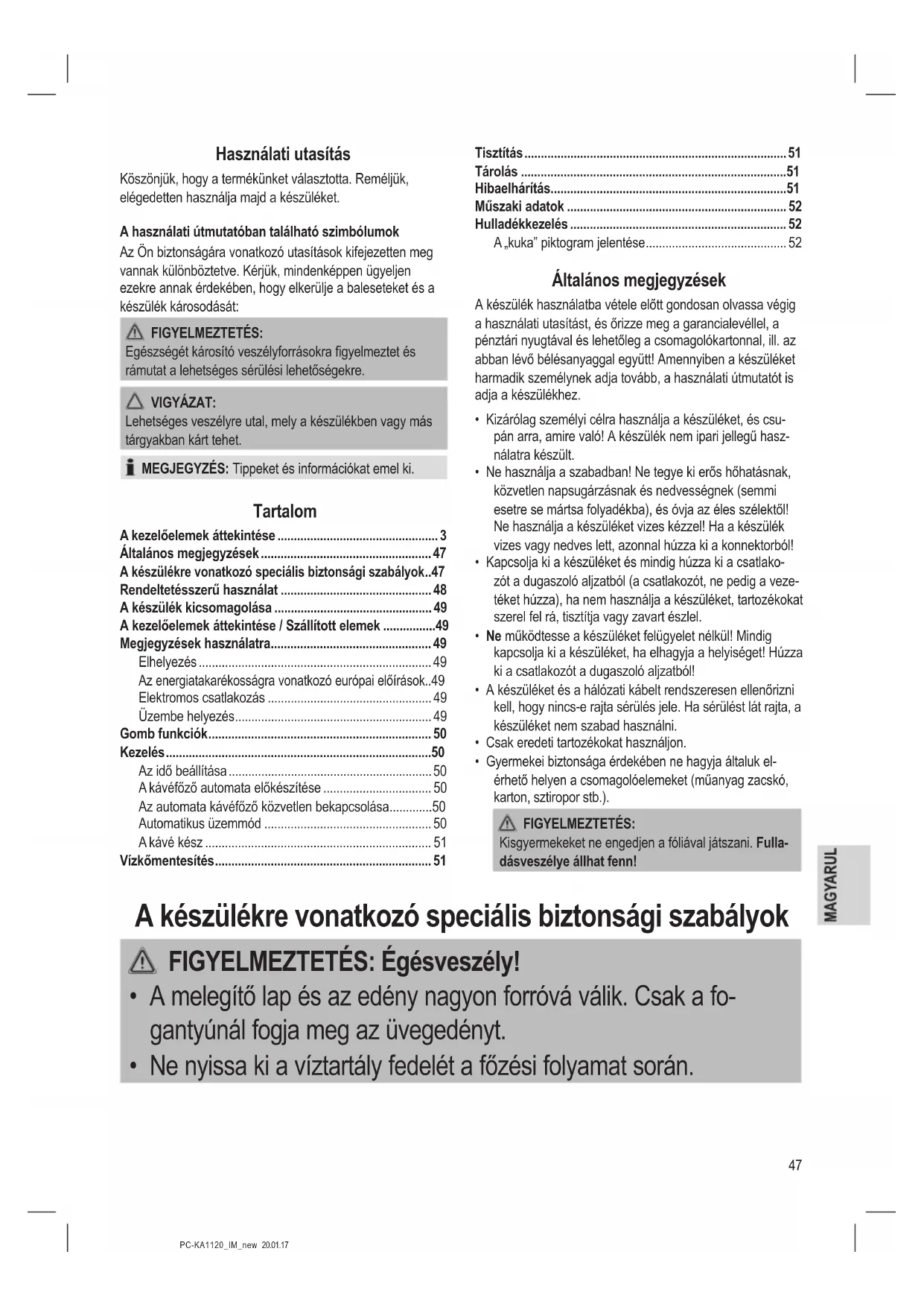- Ne próbálja saját kezűleg megjavítani a készüléket. Mindig lépjen kapcsolatba szakképzett szerelővel. Ha a villanyvezeték megsérül, a gyártónak, a szerviz ügynökségnek vagy más, hasonlóan képzett személynek kell a javítást végeznie, a veszélyek elkerülése érdeké- ben.49 PC-KA1120_IM_new 20.01.17 Rendeltetésszerű használat