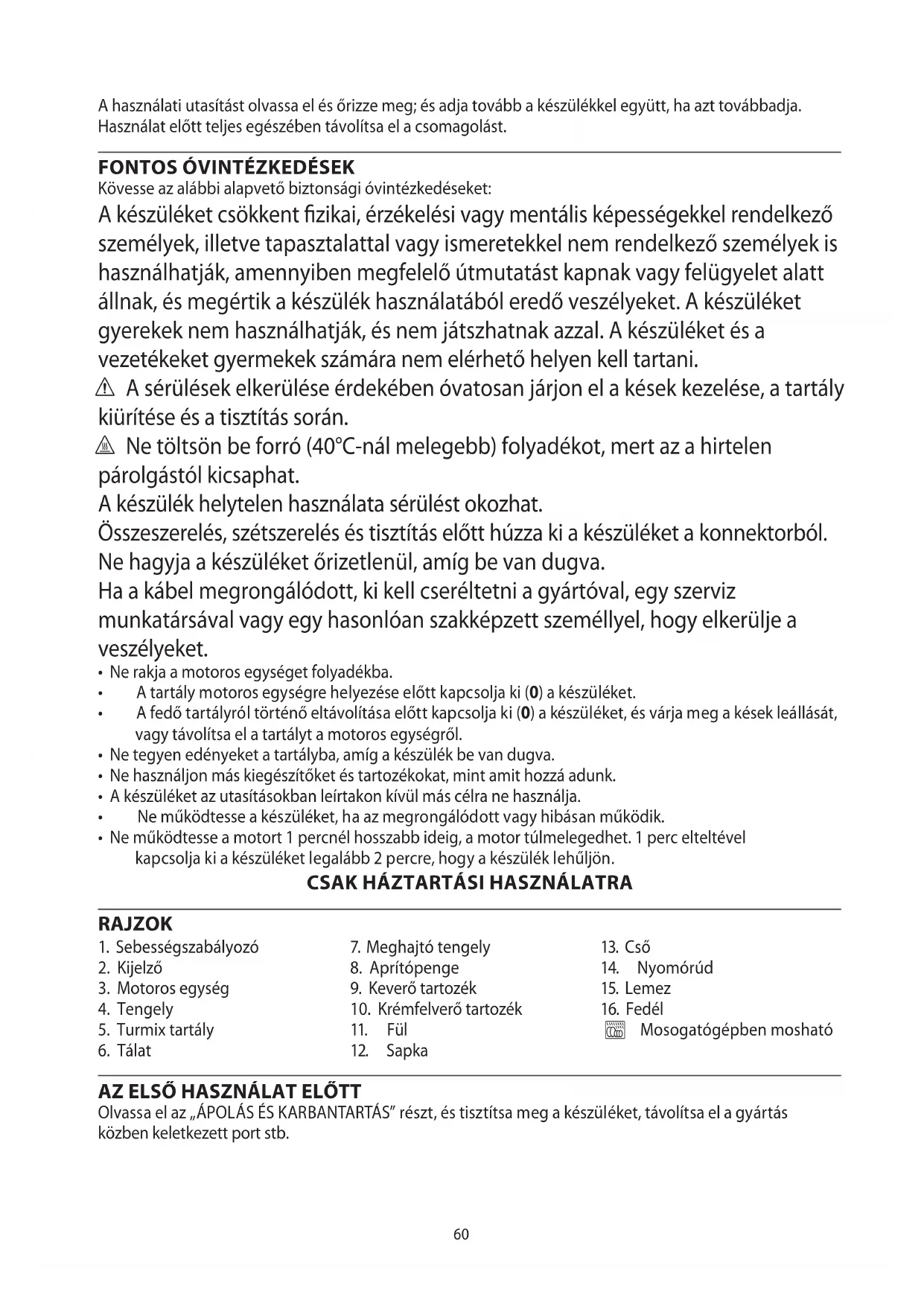 Kövesse az alábbi alapvető biztonsági óvintézkedéseket: A készüléket csökkent zikai, érzékelési vagy mentális képességekkel rendelkező személyek, illetve tapasztalattal vagy ismeretekkel nem rendelkező személyek is használhatják, amennyiben megfelelő útmutatást kapnak vagy felügyelet alatt állnak, és megértik a készülék használatából eredő veszélyeket. A készüléket gyerekek nem használhatják, és nem játszhatnak azzal. A készüléket és a vezetékeket gyermekek számára nem elérhető helyen kell tartani. c A sérülések elkerülése érdekében óvatosan járjon el a kések kezelése, a tartály kiürítése és a tisztítás során. h Ne töltsön be forró (40°C-nál melegebb) folyadékot, mert az a hirtelen párolgástól kicsaphat. A készülék helytelen használata sérülést okozhat. Összeszerelés, szétszerelés és tisztítás előtt húzza ki a készüléket a konnektorból. Ne hagyja a készüléket őrizetlenül, amíg be van dugva. Ha a kábel megrongálódott, ki kell cseréltetni a gyártóval, egy szerviz munkatársával vagy egy hasonlóan szakképzett személlyel, hogy elkerülje a veszélyeket.