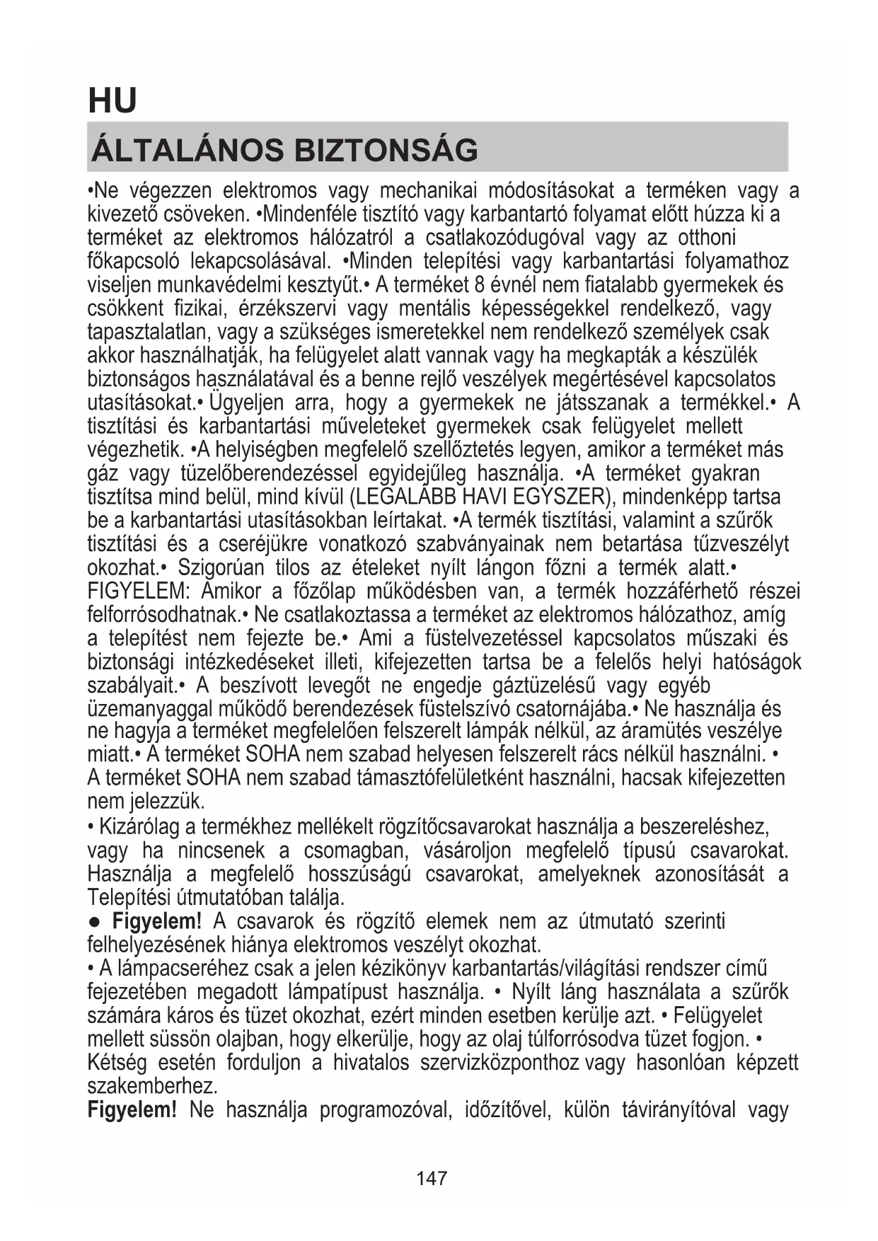 - Ne végezzen elektromos vagy mechanikai módosításokat a terméken vagy a kivezető csöveken. •Mindenféle tisztító vagy karbantartó folyamat előtt húzza ki a terméket az elektromos hálózatról a csatlakozódugóval vagy az otthoni főkapcsoló lekapcsolásával. •Minden telepítési vagy karbantartási folyamathoz viseljen munkavédelmi kesztyűt.• A terméket 8 évnél nem fiatalabb gyermekek és csökkent fizikai, érzékszervi vagy mentális képességekkel rendelkező, vagy tapasztalatlan, vagy a szükséges ismeretekkel nem rendelkező személyek csak akkor használhatják, ha felügyelet alatt vannak vagy ha megkapták a készülék biztonságos használatával és a benne rejlő veszélyek megértésével kapcsolatos utasításokat.• Ügyeljen arra, hogy a gyermekek ne játsszanak a termékkel.• A tisztítási és karbantartási műveleteket gyermekek csak felügyelet mellett végezhetik. •A helyiségben megfelelő szellőztetés legyen, amikor a terméket más gáz vagy tüzelőberendezéssel egyidejűleg használja. •A terméket gyakran tisztítsa mind belül, mind kívül (LEGALÁBB HAVI EGYSZER), mindenképp tartsa be a karbantartási utasításokban leírtakat. •A termék tisztítási, valamint a szűrők tisztítási és a cseréjükre vonatkozó szabványainak nem betartása tűzveszélyt okozhat.• Szigorúan tilos az ételeket nyílt lángon főzni a termék alatt.• FIGYELEM: Amikor a főzőlap működésben van, a termék hozzáférhető részei felforrósodhatnak.• Ne csatlakoztassa a terméket az elektromos hálózathoz, amíg a telepítést nem fejezte be.• Ami a füstelvezetéssel kapcsolatos műszaki és biztonsági intézkedéseket illeti, kifejezetten tartsa be a felelős helyi hatóságok szabályait.• A beszívott levegőt ne engedje gáztüzelésű vagy egyéb üzemanyaggal működő berendezések füstelszívó csatornájába.• Ne használja és ne hagyja a terméket megfelelően felszerelt lámpák nélkül, az áramütés veszélye miatt.• A terméket SOHA nem szabad helyesen felszerelt rács nélkül használni. • A terméket SOHA nem szabad támasztófelületként használni, hacsak kifejezetten nem jelezzük.