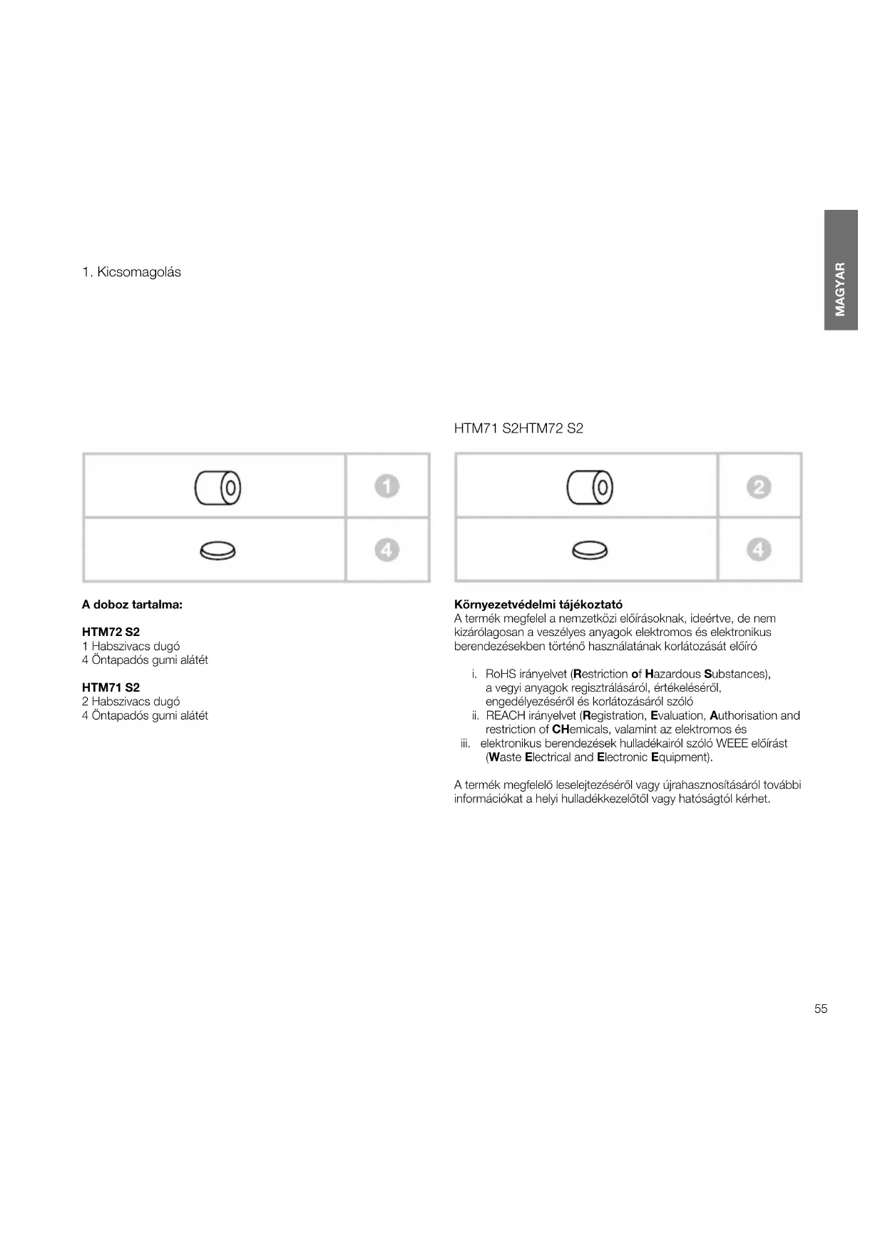 A doboz tartalma: HTM72S2 1 Habszivacs dugó 4 Öntapadós gumi alátét HTM71S2 2 Habszivacs dugó 4 Öntapadós gumi alátét Környezetvédelmi tájékoztató A termék megfelel a nemzetközi előírásoknak, ideértve, de nem kizárólagosan a veszélyes anyagok elektromos és elektronikus berendezésekben történő használatának korlátozását előíró