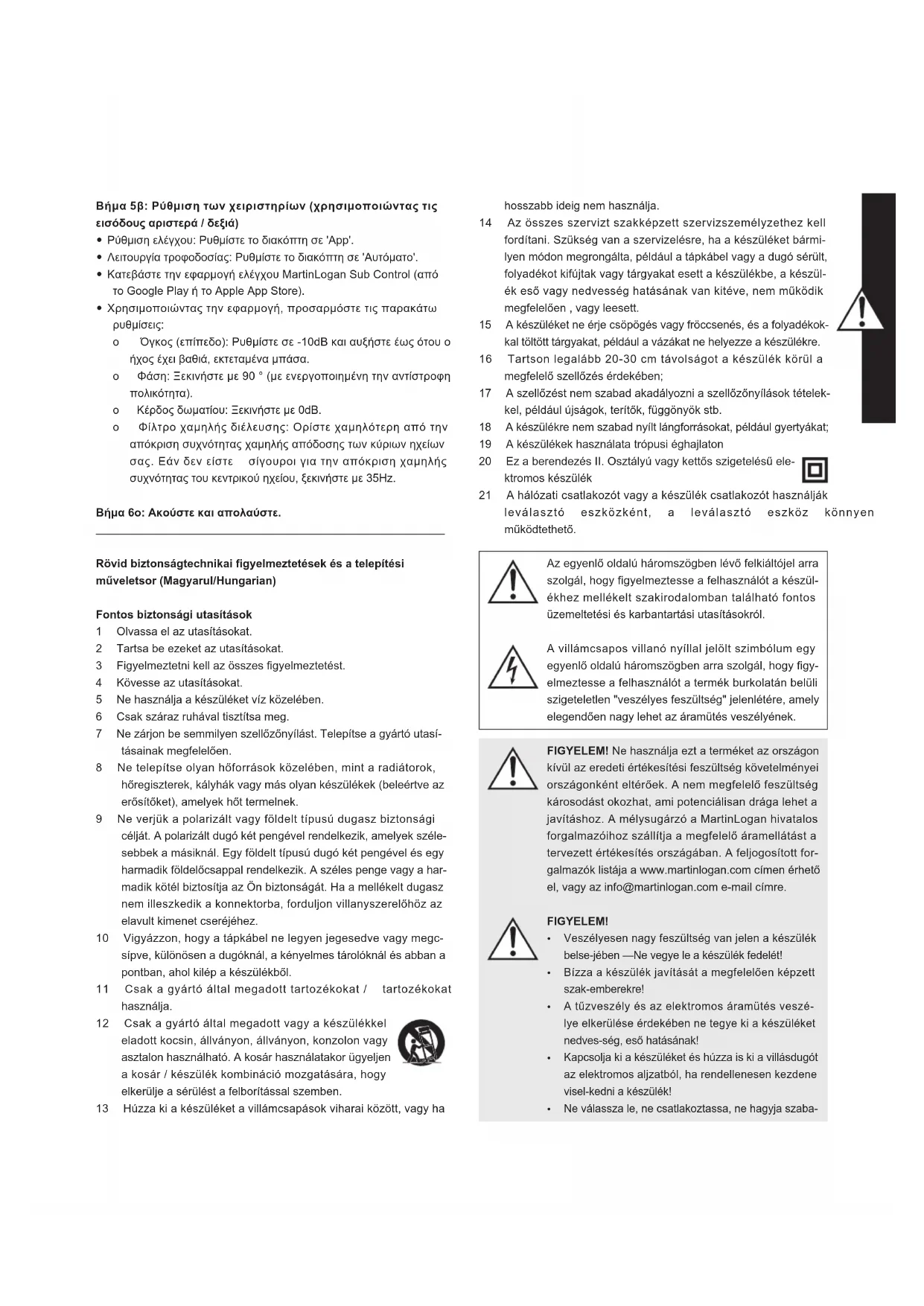 o Όγκος(επίπεδο):Ρυθμίστεσε-10dBκαιαυξήστεέωςότουο ήχοςέχειβαθιά,εκτεταμέναμπάσα. o Φάση:Ξεκινήστεμε90°(μεενεργοποιημένητηναντίστροφη πολικότητα). o Κέρδοςδωματίου:Ξεκινήστεμε0dB. o Φίλτροχαμηλήςδιέλευσης:Ορίστεχαμηλότερηαπότην απόκρισησυχνότηταςχαμηλήςαπόδοσηςτωνκύριωνηχείων σας.Εάνδενείστε σίγουροιγιατηναπόκρισηχαμηλής συχνότηταςτουκεντρικούηχείου,ξεκινήστεμε35Hz. Βήμα 6ο: Ακούστε και απολαύστε. Rövid biztonságtechnikai figyelmeztetések és a telepítési műveletsor (Magyarul/Hungarian) Fontos biztonsági utasítások 1 Olvassaelazutasításokat. 2 Tartsabeezeketazutasításokat. 3 Figyelmeztetnikellazösszesfigyelmeztetést. 4 Kövesseazutasításokat. 5 Nehasználjaakészüléketvízközelében. 6 Csakszárazruhávaltisztítsameg. 7 Nezárjonbesemmilyenszellőzőnyílást.Telepítseagyártóutasí- tásainakmegfelelően. 8 Netelepítseolyanhőforrásokközelében,mintaradiátorok, hőregiszterek,kályhákvagymásolyankészülékek(beleértveaz erősítőket),amelyekhőttermelnek. 9 Neverjükapolarizáltvagyföldelttípusúdugaszbiztonsági célját.Apolarizáltdugókétpengévelrendelkezik,amelyekszéle- sebbekamásiknál.Egyföldelttípusúdugókétpengévelésegy harmadikföldelőcsappalrendelkezik.Aszélespengevagyahar- madikkötélbiztosítjaazÖnbiztonságát.Haamellékeltdugasz nemilleszkedikakonnektorba,forduljonvillanyszerelőhözaz elavultkimenetcseréjéhez. 10 Vigyázzon,hogyatápkábelnelegyenjegesedvevagymegc- sípve,különösenadugóknál,akényelmestárolóknálésabbana pontban,aholkilépakészülékből. 11 Csakagyártóáltalmegadotttartozékokat/ tartozékokat használja. 12 Csakagyártóáltalmegadottvagyakészülékkel eladottkocsin,állványon,állványon,konzolonvagy asztalonhasználható.Akosárhasználatakorügyeljen akosár/készülékkombinációmozgatására,hogy elkerüljeasérüléstafelborítássalszemben. 13 Húzzakiakészüléketavillámcsapásokviharaiközött,vagyha hosszabbideignemhasználja. 14 Azösszesszerviztszakképzettszervizszemélyzethezkell fordítani.Szükségvanaszervizelésre,haakészüléketbármi- lyenmódonmegrongálta,példáulatápkábelvagyadugósérült, folyadékotkifújtakvagytárgyakatesettakészülékbe,akészül- ékesővagynedvességhatásánakvankitéve,nemműködik megfelelően,vagyleesett. 15 Akészüléketneérjecsöpögésvagyfröccsenés,ésafolyadékok- kaltöltötttárgyakat,példáulavázákatnehelyezzeakészülékre. 16 Tartsonlegalább20-30cmtávolságotakészülékkörüla megfelelőszellőzésérdekében; 17 Aszellőzéstnemszabadakadályozniaszellőzőnyílásoktételek- kel,példáulújságok,terítők,függönyökstb. 18 Akészülékrenemszabadnyíltlángforrásokat,példáulgyertyákat; 19 Akészülékekhasználatatrópusiéghajlaton 20 EzaberendezésII.Osztályúvagykettősszigetelésűele- ktromoskészülék 21 Ahálózaticsatlakozótvagyakészülékcsatlakozóthasználják leválasztó eszközként, a leválasztó eszköz könnyen működtethető. Azegyenlőoldalúháromszögbenlévőfelkiáltójelarra szolgál,hogyfigyelmeztesseafelhasználótakészül- ékhezmellékeltszakirodalombantalálhatófontos üzemeltetésiéskarbantartásiutasításokról. Avillámcsaposvillanónyíllaljelöltszimbólumegy egyenlőoldalúháromszögbenarraszolgál,hogyfigy- elmeztesseafelhasználótatermékburkolatánbelüli szigeteletlen"veszélyesfeszültség"jelenlétére,amely elegendőennagylehetazáramütésveszélyének. FIGYELEM! Nehasználjaeztaterméketazországon kívülazeredetiértékesítésifeszültségkövetelményei országonkénteltérőek.Anemmegfelelőfeszültség károsodástokozhat,amipotenciálisandrágaleheta javításhoz.AmélysugárzóaMartinLoganhivatalos forgalmazóihozszállítjaamegfelelőáramellátásta tervezettértékesítésországában.Afeljogosítottfor- galmazóklistájaawww.martinlogan.comcímenérhető el,vagyazinfo@martinlogan.come-mailcímre. FIGYELEM!