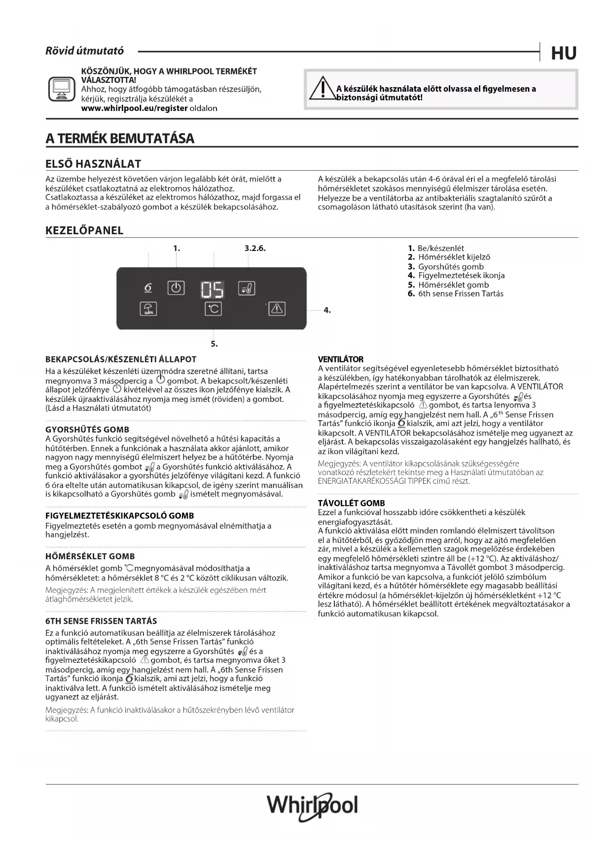- Vous pouvez également contacter notre service après-vente (voir numéro de téléphone dans le livret de garantie). Lorsque vous contactez notre Service Après-vente, veuillez indiquer les codes visibles sur la plaque signalétique de l'appareil.HU Rövid útmutató KÖSZÖNJÜK, HOGY A WHIRLPOOL TERMÉKÉT VÁLASZTOTTA! Ahhoz, hogy átfogóbb támogatásban részesüljön, kérjük, regisztrálja készülékét a www.whirlpool.eu/register oldalon A készülék használata előtt olvassa el gyelmesen a biztonsági útmutatót!