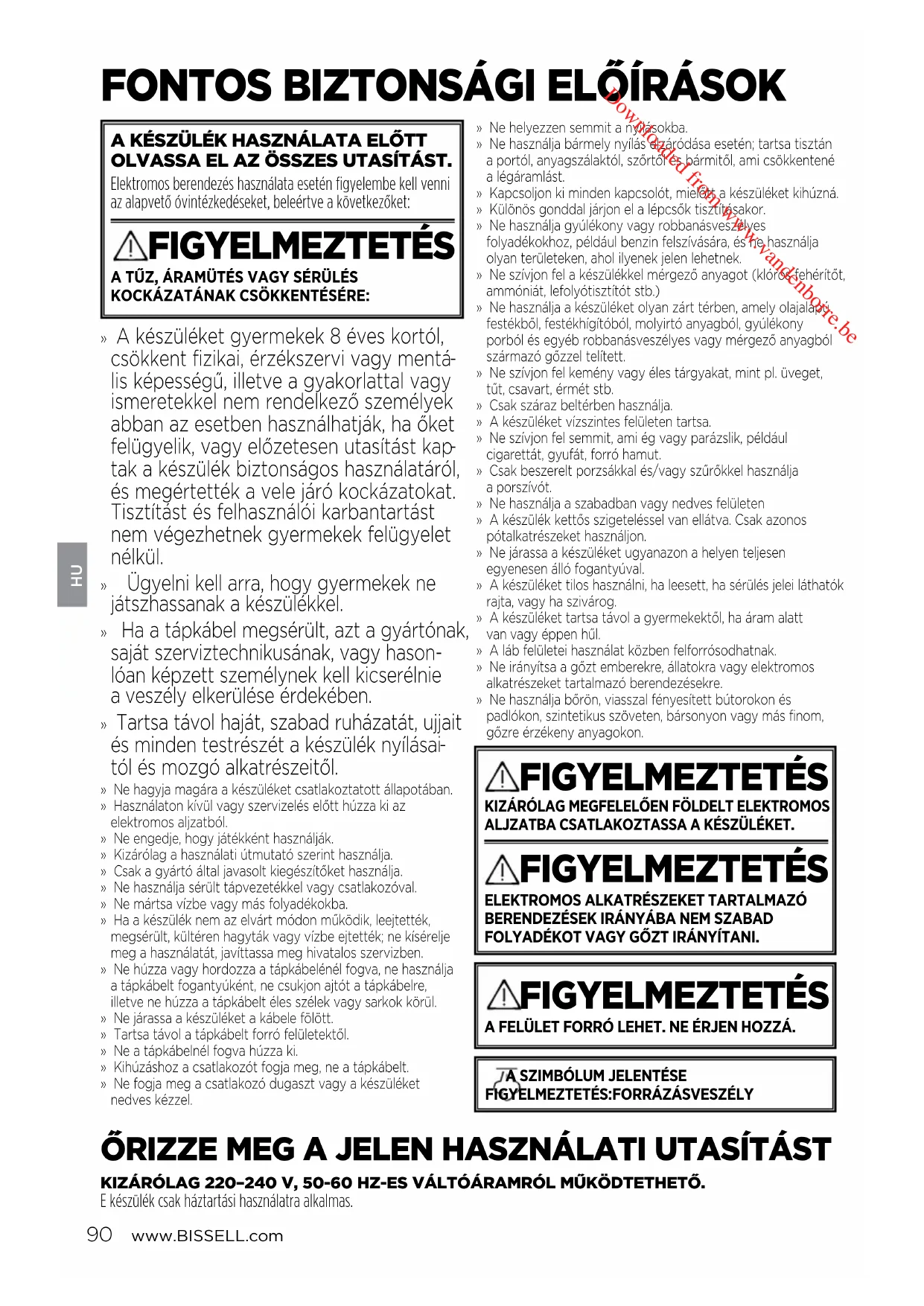 tól és mozgó alkatrészeitől. » Ne hagyja magára a készüléket csatlakoztatott állapotában.» Használaton kívül vagy szervizelés előtt húzza ki az elektromos aljzatból.» Ne engedje, hogy játékként használják.» Kizárólag a használati útmutató szerint használja.» Csak a gyártó által javasolt kiegészítőket használja.» Ne használja sérült tápvezetékkel vagy csatlakozóval.» Ne mártsa vízbe vagy más folyadékokba.» Ha a készülék nem az elvárt módon működik, leejtették, megsérült, kültéren hagyták vagy vízbe ejtették; ne kísérelje meg a használatát, javíttassa meg hivatalos szervizben.» Ne húzza vagy hordozza a tápkábelénél fogva, ne használja atápkábelt fogantyúként, ne csukjon ajtót a tápkábelre, illetve ne húzza a tápkábelt éles szélek vagy sarkok körül.» Ne járassa a készüléket a kábele fölött.» Tartsa távol a tápkábelt forró felületektől.» Ne a tápkábelnél fogva húzza ki.» Kihúzáshoz a csatlakozót fogja meg, ne a tápkábelt.» Ne fogja meg a csatlakozó dugaszt vagy a készüléket nedveskézzel.» Ne helyezzen semmit a nyílásokba.» Ne használja bármely nyílás elzáródása esetén; tartsa tisztán aportól, anyagszálaktól, szőrtől és bármitől, ami csökkentené a légáramlást.» Kapcsoljon ki minden kapcsolót, mielőtt a készüléket kihúzná.» Különös gonddal járjon el a lépcsők tisztításakor.» Ne használja gyúlékony vagy robbanásveszélyes folyadékokhoz, például benzin felszívására, és ne használja olyan területeken, ahol ilyenek jelen lehetnek.» Ne szívjon fel a készülékkel mérgező anyagot (klóros fehérítőt, ammóniát, lefolyótisztítót stb.)» Ne használja a készüléket olyan zárt térben, amely olajalapú festékből, festékhígítóból, molyirtó anyagból, gyúlékony porból és egyéb robbanásveszélyes vagy mérgező anyagból származó gőzzel telített.» Ne szívjon fel kemény vagy éles tárgyakat, mint pl. üveget, tűt,csavart, érmét stb.» Csak száraz beltérben használja.» A készüléket vízszintes felületen tartsa.» Ne szívjon fel semmit, ami ég vagy parázslik, például cigarettát, gyufát, forró hamut.» Csak beszerelt porzsákkal és/vagy szűrőkkel használja aporszívót.» Ne használja a szabadban vagy nedves felületen» A készülék kettős szigeteléssel van ellátva. Csak azonos pótalkatrészeket használjon. » Ne járassa a készüléket ugyanazon a helyen teljesen egyenesen álló fogantyúval.» A készüléket tilos használni, ha leesett, ha sérülés jelei láthatók rajta, vagy ha szivárog. » A készüléket tartsa távol a gyermekektől, ha áram alatt vanvagy éppen hűl. » A láb felületei használat közben felforrósodhatnak. » Ne irányítsa a gőzt emberekre, állatokra vagy elektromos alkatrészeket tartalmazó berendezésekre.» Ne használja bőrön, viasszal fényesített bútorokon és padlókon, szintetikus szöveten, bársonyon vagy más finom, gőzre érzékeny anyagokon. ŐRIZZE MEG A JELEN HASZNÁLATI UTASÍTÁST KIZÁRÓLAG 220–240 V, 50-60 HZ-ES VÁLTÓÁRAMRÓL MŰKÖDTETHETŐ. E készülék csak háztartási használatra alkalmas. Downloaded from www.vandenborre.beHU www.BISSELL.com