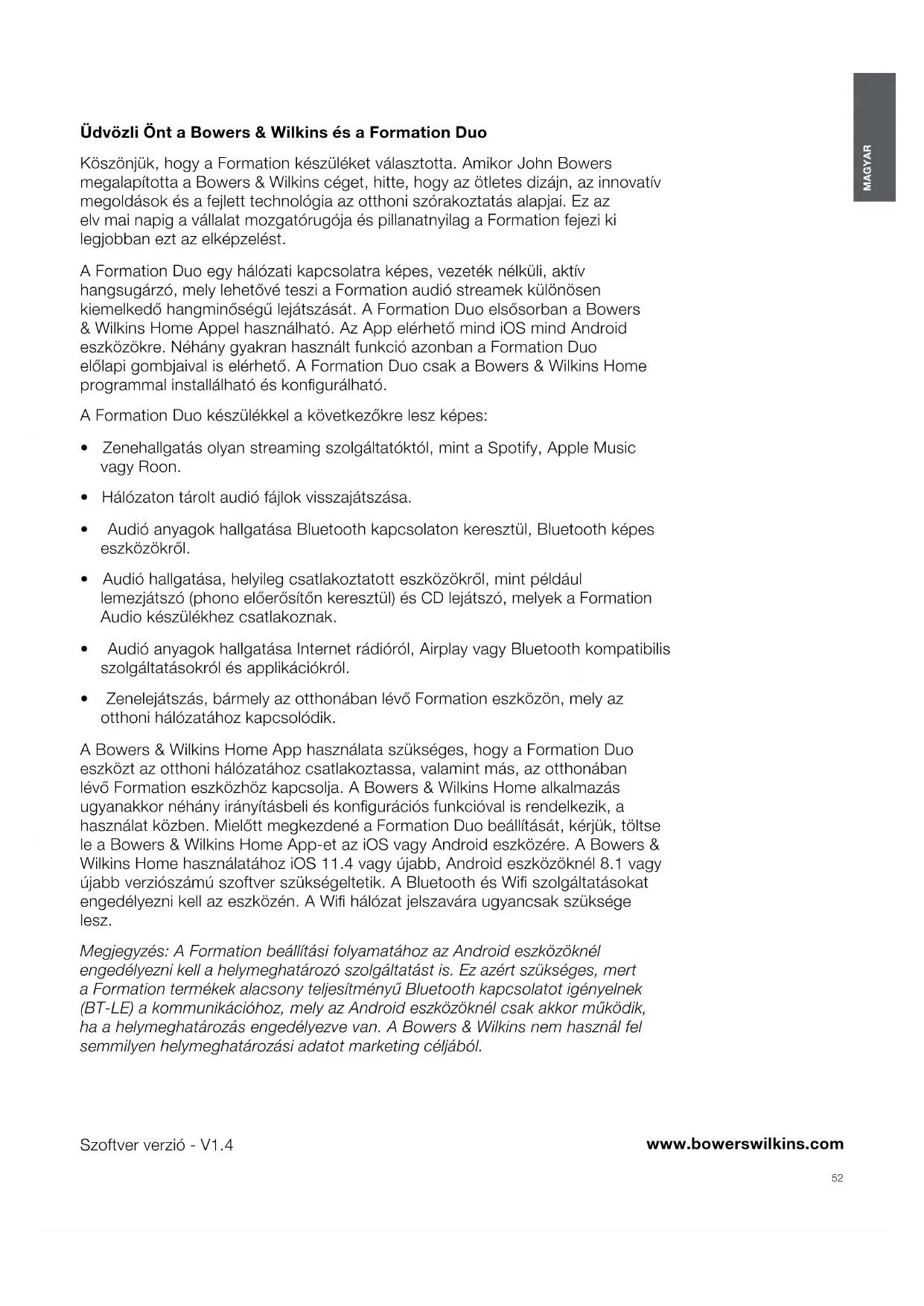 - Zenelejátszás, bármely az otthonában lévő Formation eszközön, mely az otthoni hálózatához kapcsolódik. A Bowers & Wilkins Home App használata szükséges, hogy a Formation Duo eszközt az otthoni hálózatához csatlakoztassa, valamint más, az otthonában lévő Formation eszközhöz kapcsolja. A Bowers & Wilkins Home alkalmazás ugyanakkor néhány irányításbeli és kongurációs funkcióval is rendelkezik, a használat közben. Mielőtt megkezdené a Formation Duo beállítását, kérjük, töltse le a Bowers & Wilkins Home App-et az iOS vagy Android eszközére. A Bowers & Wilkins Home használatához iOS 11.4 vagy újabb, Android eszközöknél 8.1 vagy újabb verziószámú szoftver szükségeltetik. A Bluetooth és Wi szolgáltatásokat engedélyezni kell az eszközén. A Wi hálózat jelszavára ugyancsak szüksége lesz. Megjegyzés: A Formation beállítási folyamatához az Android eszközöknél engedélyezni kell a helymeghatározó szolgáltatást is. Ez azért szükséges, mert a Formation termékek alacsony teljesítményű Bluetooth kapcsolatot igényelnek (BT-LE) a kommunikációhoz, mely az Android eszközöknél csak akkor működik, ha a helymeghatározás engedélyezve van. A Bowers & Wilkins nem használ fel semmilyen helymeghatározási adatot marketing céljából. Szoftver verzió - V1.4 MAGYAR Contents MAGYAR 1