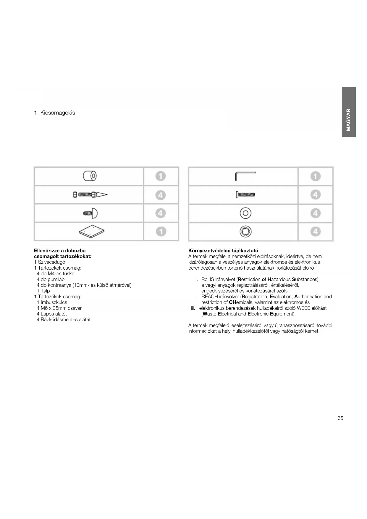 Ellenőrizze a dobozba csomagolt tartozékokat: 1 Szivacsdugó 1 Tartozékok csomag: 4 db M4-es tüske 4 db gumiláb 4 db kontraanya (10mm- es külső átmérővel) 1 Talp 1 Tartozékok csomag: 1 Imbuszkulcs 4 M6 x 35mm csavar 4 Lapos alátét 4 Rázkódásmentes alátét Környezetvédelmi tájékoztató A termék megfelel a nemzetközi előírásoknak, ideértve, de nem kizárólagosan a veszélyes anyagok elektromos és elektronikus berendezésekben történő használatának korlátozását előíró