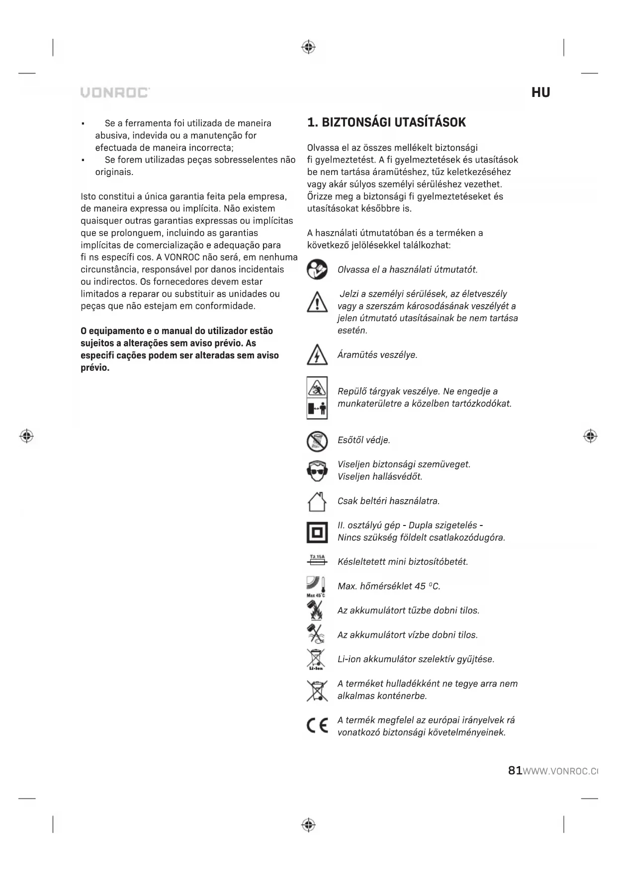 Ne nyissa fel az akkumulátort. Rövidzárlat veszélye. b) Védje az akkumulátort a hőbehatástól, pl. ne tegye ki folyamatos erős napsugárzásnak, valamint védje a tűztől, víztől és nedvességtől. Robbanásveszély. c) Ha az akkumulátor sérült, vagy rendellenesen használják, gőzök áramolhatnak belőle. Szellőztesse át a munkaterületet, és ha egészségi panaszai vannak, kérjen orvosi segítséget. A gőzök irritálhatják a légutakat. d) Az akkumulátort csak a Vonroc termékéhez használja. Ezzel az intézkedéssel veszélyes túlterheléstől védi az akkumulátorát.
