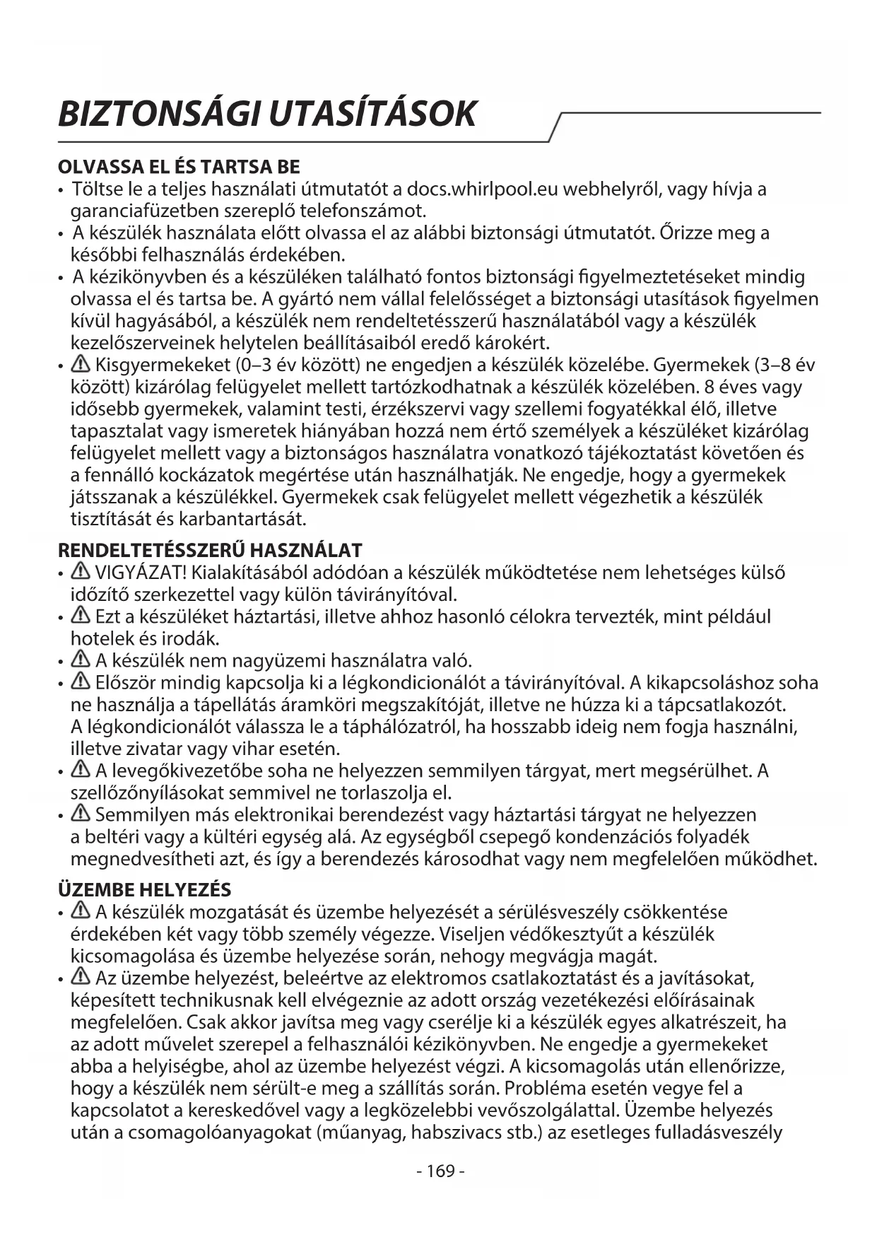 - Az egység fűtési módról jégtelenítésre vált. A jelzőfény ki fog aludni, és a berendezés visszatér fűtési módba. Megjegyzés: Ha a probléma továbbra is fennáll, kapcsolja ki a berendezést és válassza le a tápellátásról, majd lépjen kapcsolatba a legközelebbi hivatalos Whirlpool szervizközponttal. A berendezést ne próbálja meg maga áthelyezni, megjavítani, szétszerelni vagy módosítani.- 179 -