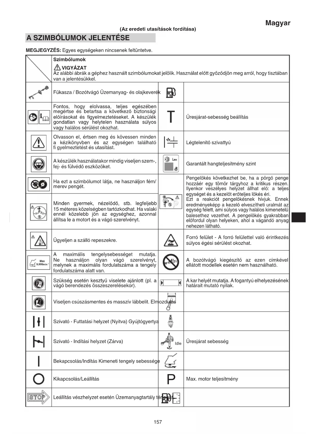 MEGJEGYZÉS: Egyes egységeken nincsenek feltüntetve. Szimbólumok VIGYÁZAT Az alábbi ábrák a géphez használt szimbólumokat jelölik. Használat előtt győződjön meg arról, hogy tisztában van a jelentésükkel. Fűkasza / Bozótvágó Üzemanyag- és olajkeverék Fontos, hogy elolvassa, teljes egészében megértse és betartsa a következő biztonsági előírásokat és fi gyelmeztetéseket. A készülék gondatlan vagy helytelen használata súlyos vagy halálos sérülést okozhat. Üresjárat-sebesség beállítás Olvasson el, értsen meg és kövessen minden a kézikönyvben és az egységen található fi gyelmeztetést és utasítást. Légtelenítő szivattyú A készülék használatakor mindig viseljen szem-, fej- és fülvédő eszközöket. Garantált hangteljesítmény szint Ha ezt a szimbólumot látja, ne használjon fém/ merev pengét. Pengelökés következhet be, ha a pörgő penge hozzáér egy tömör tárgyhoz a kritikus részen. Ilyenkor veszélyes helyzet állhat elő: a teljes egységet és a kezelőt erőteljes lökés éri. Ezt a reakciót pengelökésnek hívjuk. Ennek eredményeképp a kezelő elveszítheti uralmát az egység felett, ami súlyos vagy halálos kimenetelű balesethez vezethet. A pengelökés gyakrabban előfordul olyan helyeken, ahol a vágandó anyag nehezen látható. Minden gyermek, nézelődő, stb. legfeljebb 15 méteres közelségben tartózkodhat. Ha valaki ennél közelebb jön az egységhez, azonnal állítsa le a motort és a vágó szerelvényt. Ügyeljen a szálló repeszekre. Forró felület - A forró felülettel való érintkezés súlyos égési sérülést okozhat. min
