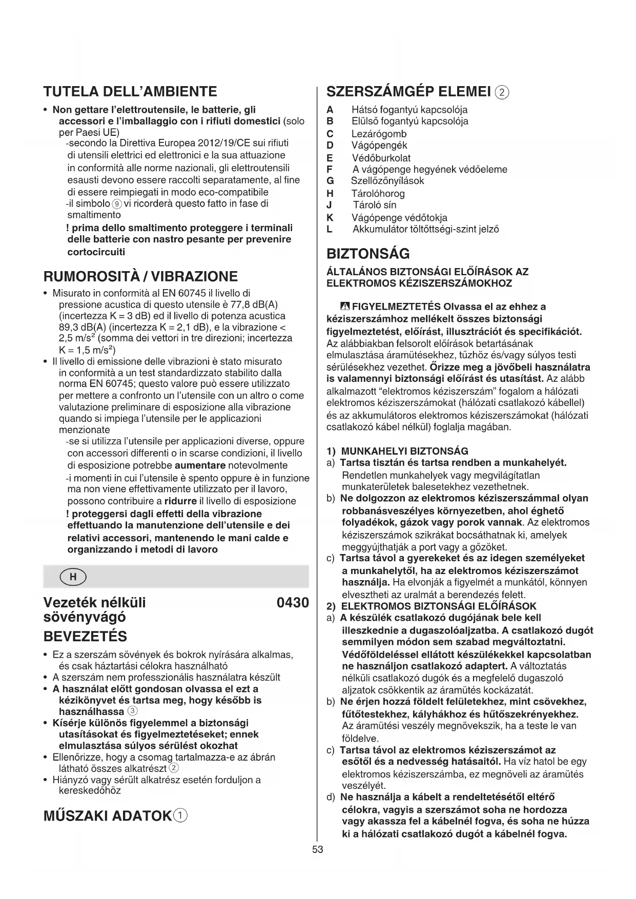 A Hátsó fogantyú kapcsolója B Elülső fogantyú kapcsolója C Lezárógomb D Vágópengék E Védőburkolat F A vágópenge hegyének védőeleme G Szellőzőnyílások H Tárolóhorog J Tároló sín K Vágópenge védőtokja L Akkumulátor töltőttségi-szint jelző BIZTONSÁG ÁLTALÁNOS BIZTONSÁGI ELŐÍRÁSOK AZ