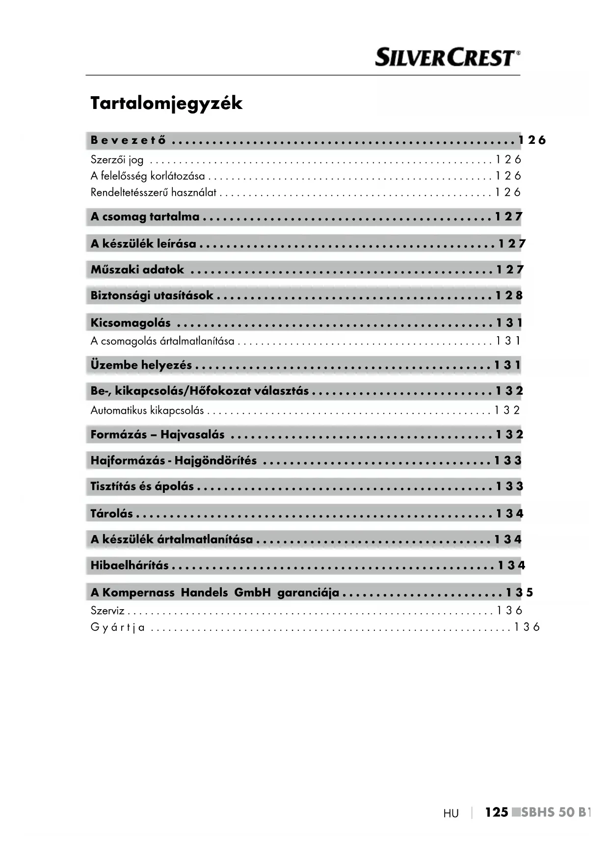HASZNÁLATI ÚTMUTATÓ SBHS 50 B1 SILVERCREST