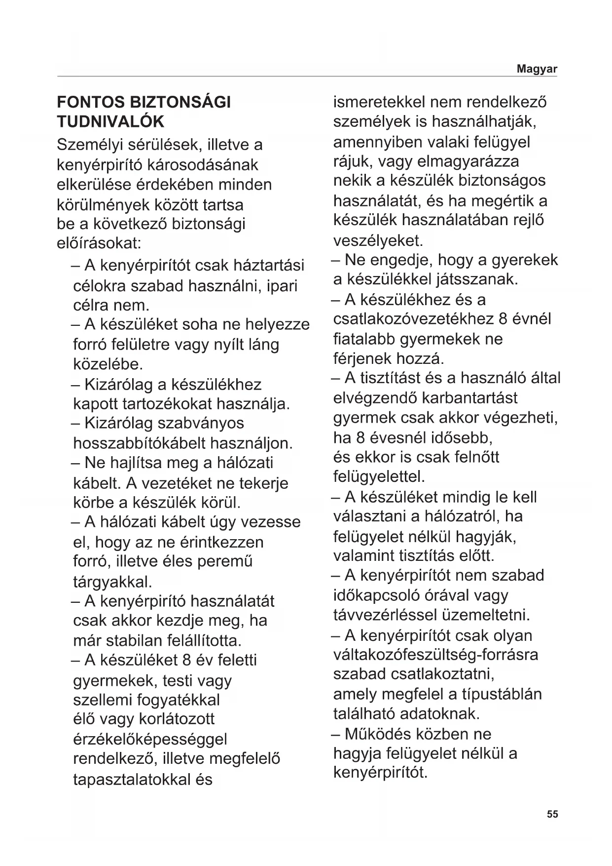 RENDELTETÉSE A kenyérpirító kizárólag toast kenyér, szeletelt kenyér és zsemle pirítására szolgál házi használatra, háztartásban szokásos mennyiségben. A kenyérpirító élelmiszerrel való érintkezésre alkalmas. A nem rendeltetésszerű használat, illetve a nem megfelelő üzemeltetés súlyos sérülésekhez vezethet, vagy kárt okozhat a kenyérpirítóban. Ebben az esetben a vásárló minden garanciális és kártérítési igénye érvényét veszti.