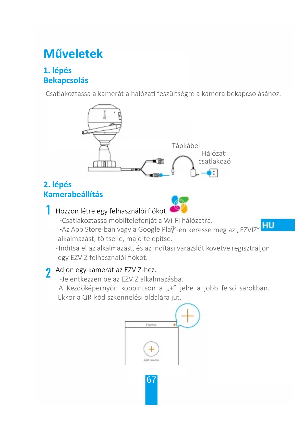 Adjon egy kamerát az EZVIZ-hez. -Jelentkezzen be az EZVIZ alkalmazásba. -A Kezdőképernyőn koppintson a „+” jelre a jobb felső sarokban. Ekkor a QR-kód szkennelési oldalára jut.68 -Szkennelje be a kamera testén látható QR-kódot. -A Wi-Fi kongurálás befejezéséhez kövesse az EZVIZ alkalmazás varázslójának utasításait. Vezetékes összeköetést is választhat.