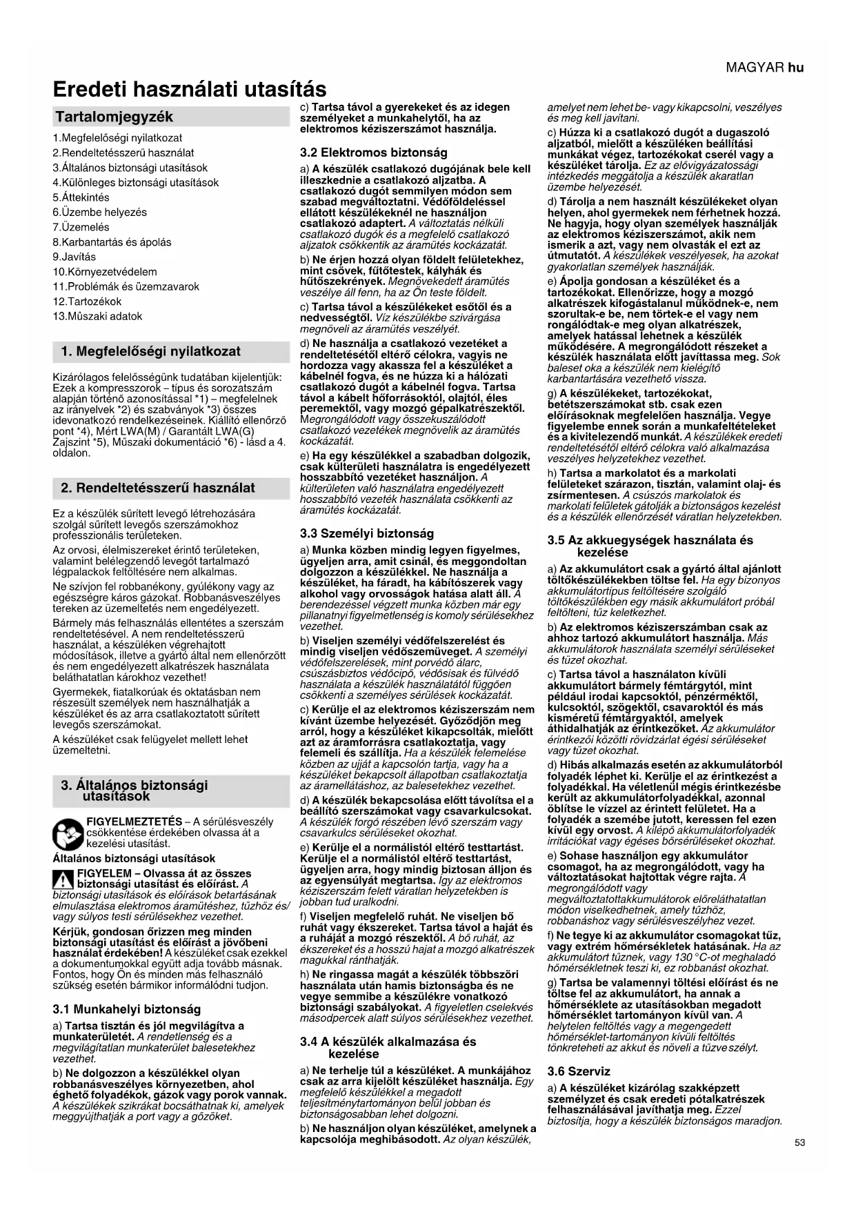 Eredeti használati utasítás 1.Megfelelőségi nyilatkozat 2.Rendeltetésszerű használat 3.Általános biztonsági utasítások 4.Különleges biztonsági utasítások 5.Áttekintés 6.Üzembe helyezés 7.Üzemelés 8.Karbantartás és ápolás 9.Javítás 10.Környezetvédelem 11.Problémák és üzemzavarok 12.Tartozékok 13.Mûszaki adatok Kizárólagos felelősségünk tudatában kijelentjük: Ezek a kompresszorok – típus és sorozatszám alapján történő azonosítással *1) – megfelelnek az irányelvek *2) és szabványok *3) összes idevonatkozó rendelkezéseinek. Kiállító ellenőrző pont *4), Mért LWA(M) / Garantált LWA(G) Zajszint *5), Műszaki dokumentáció *6) - lásd a 4. oldalon. Ez a készülék sűrített levegő létrehozására szolgál sűrített levegős szerszámokhoz professzionális területeken. Az orvosi, élelmiszereket érintő területeken, valamint belélegzendő levegőt tartalmazó légpalackok feltöltésére nem alkalmas. Ne szívjon fel robbanékony, gyúlékony vagy az egészségre káros gázokat. Robbanásveszélyes tereken az üzemeltetés nem engedélyezett. Bármely más felhasználás ellentétes a szerszám rendeltetésével. A nem rendeltetésszerű használat, a készüléken végrehajtott módosítások, illetve a gyártó által nem ellenőrzött és nem engedélyezett alkatrészek használata beláthatatlan károkhoz vezethet! Gyermekek, fiatalkorúak és oktatásban nem részesült személyek nem használhatják a készüléket és az arra csatlakoztatott sűrített levegős szerszámokat. A készüléket csak felügyelet mellett lehet üzemeltetni. FIGYELMEZTETÉS – A sérülésveszély csökkentése érdekében olvassa át a kezelési utasítást. Általános biztonsági utasítások FIGYELEM – Olvassa át az összes biztonsági utasítást és előírást. A biztonsági utasítások és előírások betartásának elmulasztása elektromos áramütéshez, tűzhöz és/ vagy súlyos testi sérülésekhez vezethet. Kérjük, gondosan őrizzen meg minden biztonsági utasítást és elő írást a jövőbeni