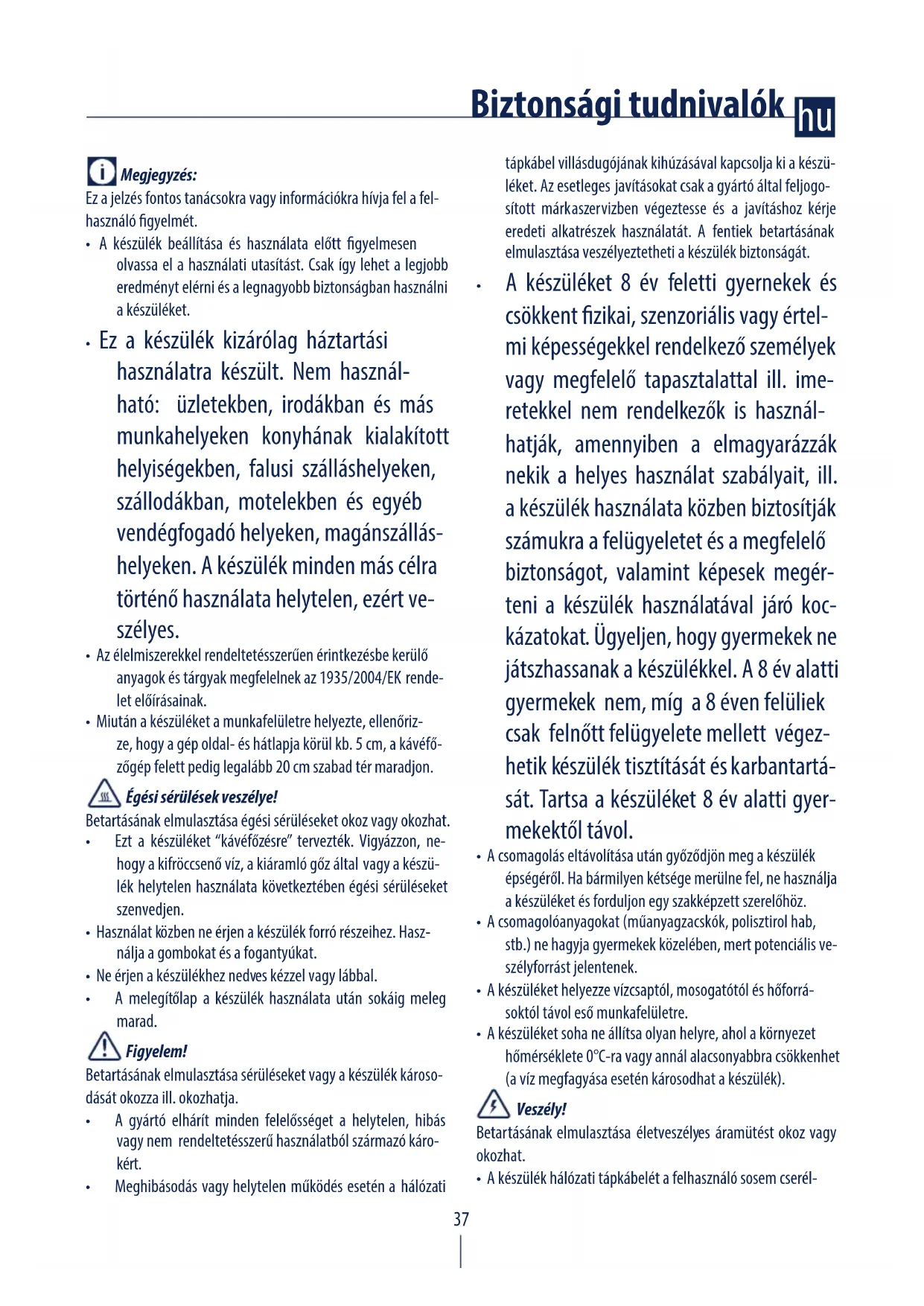 - A készüléket 8 év feletti gyernekek és csökkent zikai, szenzoriális vagy értel- mi képességekkel rendelkező személyek vagy megfelelő tapasztalattal ill. ime- retekkel nem rendelkezők is használ- hatják, amennyiben a elmagyarázzák nekik a helyes használat szabályait, ill. a készülék használata közben biztosítják számukra a felügyeletet és a megfelelő biztonságot, valamint képesek megér- teni a készülék használatával járó koc- kázatokat. Ügyeljen, hogy gyermekek ne játszhassanak a készülékkel. A 8 év alatti gyermekek nem, míg a 8 éven felüliek csak felnőtt felügyelete mellett végez- hetik készülék tisztítását és karbantartá- sát. Tartsa a készüléket 8 év alatti gyer- mekektől távol.