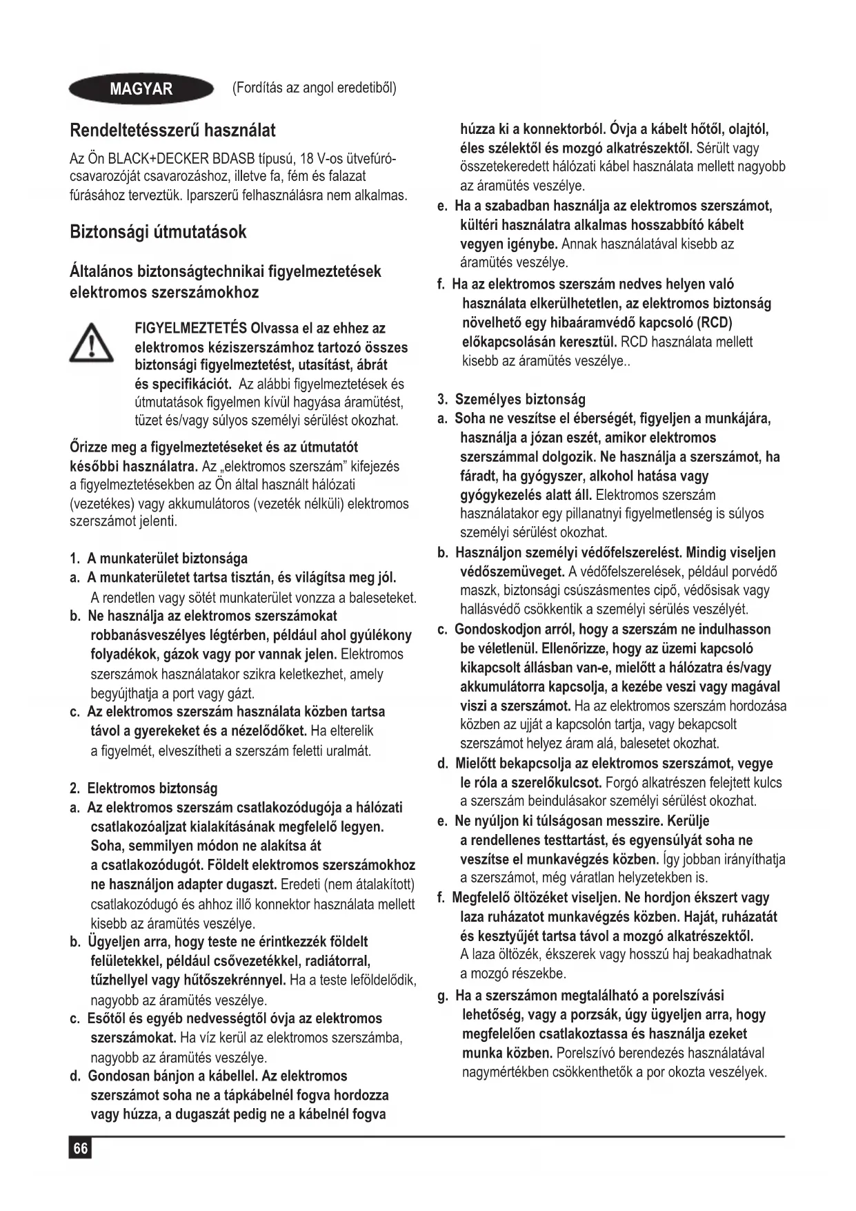 a. Soha ne veszítse el éberségét, figyeljen a munkájára, használja a józan eszét, amikor elektromos szerszámmal dolgozik. Ne használja a szerszámot, ha fáradt, ha gyógyszer, alkohol hatása vagy gyógykezelés alatt áll. Elektromos szerszám használatakor egy pillanatnyi figyelmetlenség is súlyos személyi sérülést okozhat. b. Használjon személyi védőfelszerelést. Mindig viseljen védőszemüveget. A védőfelszerelések, például porvédő maszk, biztonsági csúszásmentes cipő, védősisak vagy hallásvédő csökkentik a személyi sérülés veszélyét. c. Gondoskodjon arról, hogy a szerszám ne indulhasson be véletlenül. Ellenőrizze, hogy az üzemi kapcsoló kikapcsolt állásban van-e, mielőtt a hálózatra és/vagy akkumulátorra kapcsolja, a kezébe veszi vagy magával viszi a szerszámot. Ha az elektromos szerszám hordozása közben az ujját a kapcsolón tartja, vagy bekapcsolt szerszámot helyez áram alá, balesetet okozhat. d. Mielőtt bekapcsolja az elektromos szerszámot, vegye le róla a szerelőkulcsot. Forgó alkatrészen felejtett kulcs a szerszám beindulásakor személyi sérülést okozhat. e. Ne nyúljon ki túlságosan messzire. Kerülje a rendellenes testtartást, és egyensúlyát soha ne veszítse el munkavégzés közben. Így jobban irányíthatja a szerszámot, még váratlan helyzetekben is. f. Megfelelő öltözéket viseljen. Ne hordjon ékszert vagy laza ruházatot munkavégzés közben. Haját, ruházatát és kesztyűjét tartsa távol a mozgó alkatrészektől. A laza öltözék, ékszerek vagy hosszú haj beakadhatnak a mozgó részekbe. g. Ha a szerszámon megtalálható a porelszívási lehetőség, vagy a porzsák, úgy ügyeljen arra, hogy megfelelően csatlakoztassa és használja ezeket munka közben. Porelszívó berendezés használatával nagymértékben csökkenthetők a por okozta veszélyek. (Fordítás az angol eredetiből) MAGYAR67 h. Ne hagyja, hogy a szerszámok gyakori használata révén megismerkedjen önelégültséggel és figyelmen kívül hagyja a szerszámbiztonsági elveket. A gondatlan fellépés másodperc töredéke alatt súlyos sérüléseket okozhat.