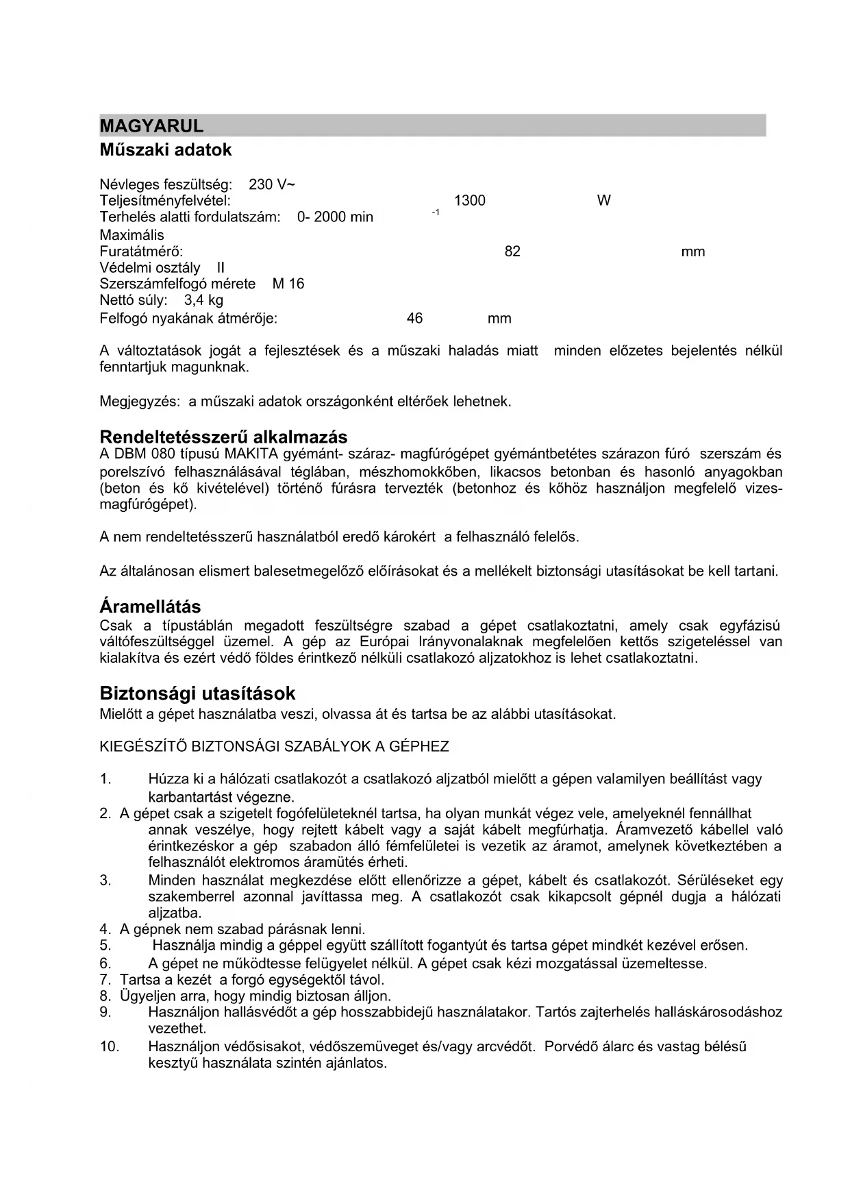 Maximális Furatátmérő: 82 mm Védelmi osztály II Szerszámfelfogó mérete M 16 Nettó súly: 3,4 kg Felfogó nyakának átmérője: 46 mm A változtatások jogát a fejlesztések és a műszaki haladás miatt minden előzetes bejelentés nélkül fenntartjuk magunknak. Megjegyzés: a műszaki adatok országonként eltérőek lehetnek. Rendeltetésszerű alkalmazás A DBM 080 típusú MAKITA gyémánt- száraz- magfúrógépet gyémántbetétes szárazon fúró szerszám és porelszívó felhasználásával téglában, mészhomokkőben, likacsos betonban és hasonló anyagokban (beton és kő kivételével) történő fúrásra tervezték (betonhoz és kőhöz használjon megfelelő vizes- magfúrógépet). A nem rendeltetésszerű használatból eredő károkért a felhasználó felelős. Az általánosan elismert balesetmegelőző előírásokat és a mellékelt biztonsági utasításokat be kell tartani. Áramellátás Csak a típustáblán megadott feszültségre szabad a gépet csatlakoztatni, amely csak egyfázisú váltófeszültséggel üzemel. A gép az Európai Irányvonalaknak megfelelően kettős szigeteléssel van kialakítva és ezért védő földes érintkező nélküli csatlakozó aljzatokhoz is lehet csatlakoztatni. Biztonsági utasítások Mielőtt a gépet használatba veszi, olvassa át és tartsa be az alábbi utasításokat. KIEGÉSZÍTŐ BIZTONSÁGI SZABÁLYOK A GÉPHEZ