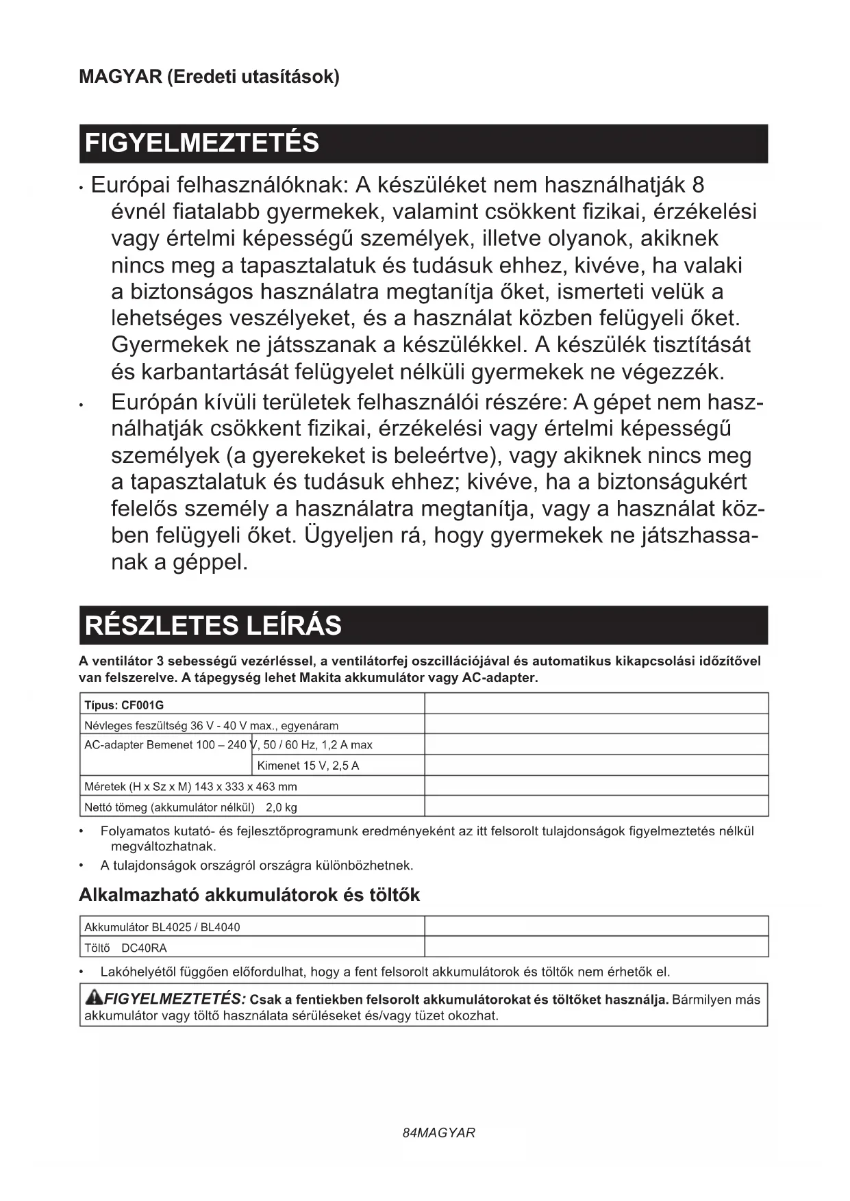 „MŰSZAKIADATOK”fejezetébenmegjelöltMakita lítium-ion akkumulátorral vagy AC-adapterrel. Egyéb akkumulátorok használata tüzet okozhat. Azakkumulátortcsakamegjelölttöltőveltöltse újra.Egyadotttípusúakkumulátorhozhasznál- hatótöltőmásakkumulátorokkalvalóhasználata tüzet okozhat.