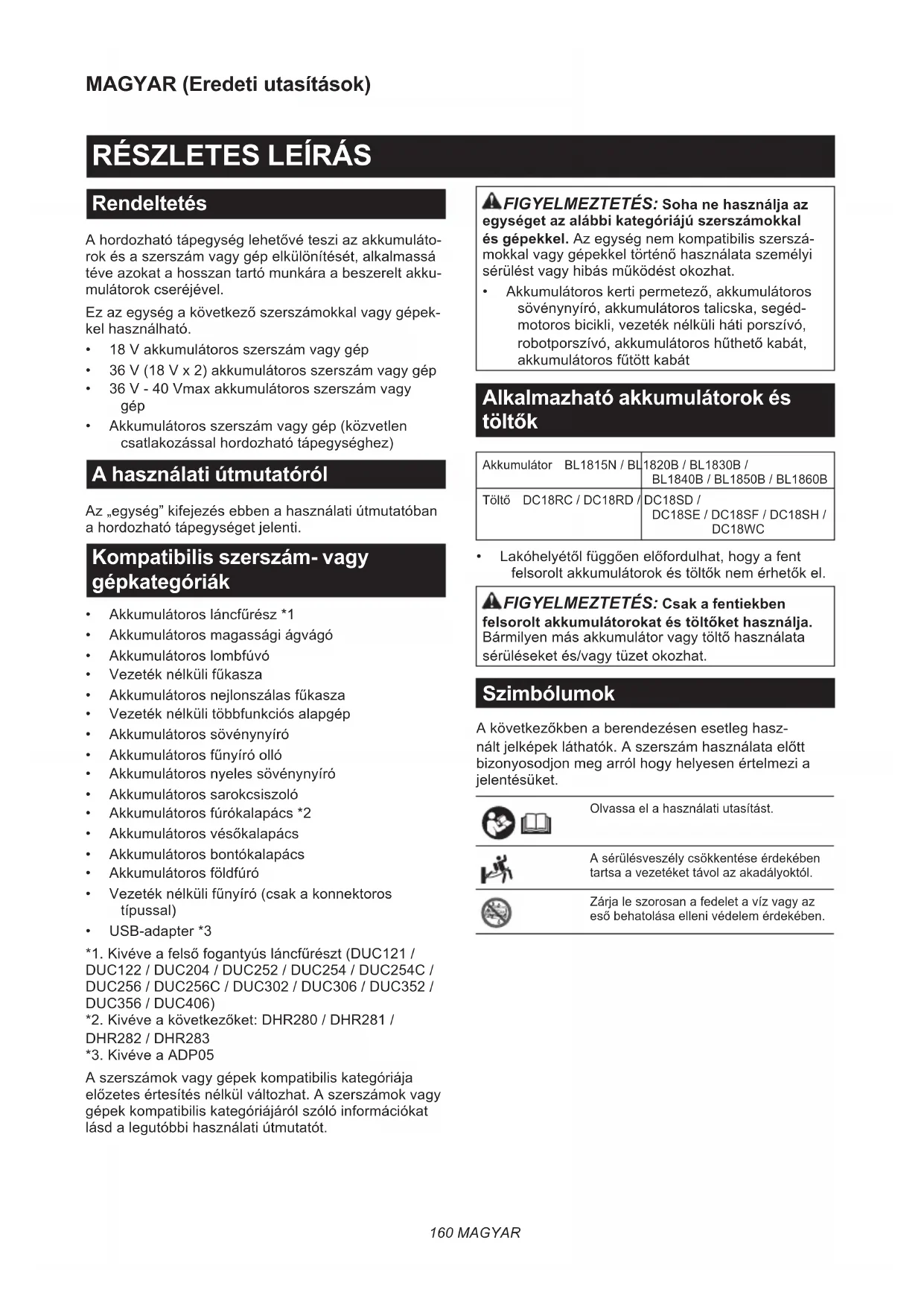 Rendeltetés Ahordozhatótápegységlehetővétesziazakkumuláto- rokésaszerszámvagygépelkülönítését,alkalmassá téveazokatahosszantartómunkáraabeszereltakku- mulátorokcseréjével. Ezazegységakövetkezőszerszámokkalvagygépek- kelhasználható.