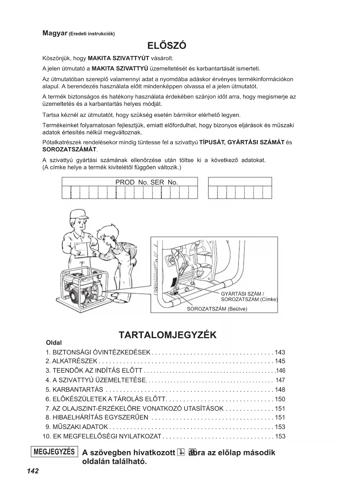 Nazwa handlowa Zmierzony poziom mocy akustycznej Gwarantowany poziom mocy akustycznej EW2050H 100 dB(A) 101 dB(A) EW3050H 103 dB(A) 103 dB(A) EW2051H 101 dB(A) 103 dB(A) EW3051H 104 dB(A) 105 dB(A) Te poziomy hałasu niekoniecznie wskazują bezpieczny poziom roboczy. Jednakże użytkownik będzie w stanie lepiej ocenić zagrożenia i ryzyko korzystając z tych informacji. Uwaga: Poziom hałasu zmienia się wraz z parametrami technicznymi. Dane techniczne mogą ulec zmianie bez uprzedzenia.142 ELŐSZÓ Köszönjük, hogy MAKITA SZIVATTYÚT vásárolt. A jelen útmutató a MAKITA SZIVATTYÚ üzemeltetését és karbantartását ismerteti. Az útmutatóban szereplő valamennyi adat a nyomdába adáskor érvényes termékinformációkon alapul. A berendezés használata előtt mindenképpen olvassa el a jelen útmutatót.A termék biztonságos és hatékony használata érdekében szánjon időt arra, hogy megismerje az üzemeltetés és a karbantartás helyes módját.Tartsa kéznél az útmutatót, hogy szükség esetén bármikor elérhető legyen.Termékeinket folyamatosan fejlesztjük, emiatt előfordulhat, hogy bizonyos eljárások és műszaki adatok értesítés nélkül megváltoznak. Pótalkatrészek rendelésekor mindig tüntesse fel a szivattyú TÍPUSÁT, GYÁRTÁSI SZÁMÁT és SOROZATSZÁMÁT.A szivattyú gyártási számának ellenőrzése után töltse ki a következő adatokat. (A címke helye a termék kivitelétől függően változik.) PROD No. SER No. GYÁRTÁSI SZÁM / SOROZATSZÁM (Címke)SOROZATSZÁM (Beütve) A szövegben hivatkozott – ábra az előlap második oldalán található. MEGJEGYZÉS TARTALOMJEGYZÉK Oldal