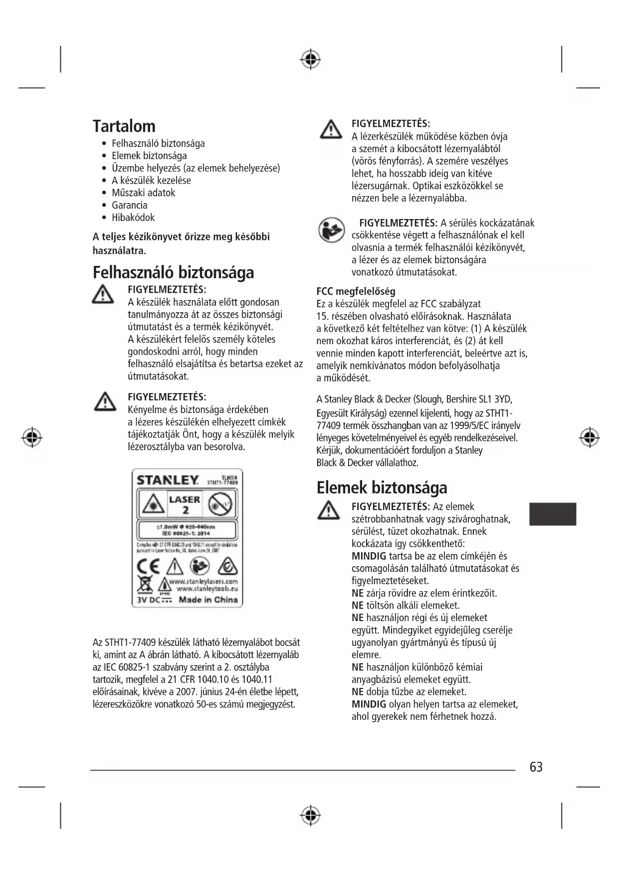 - Hibakódok A teljes kézikönyvet őrizze meg későbbi használatra. Felhasználó biztonsága FIGYELMEZTETÉS: A készülék használata előtt gondosan tanulmányozza át az összes biztonsági útmutatást és a termék kézikönyvét. A készülékért felelős személy köteles gondoskodni arról, hogy minden felhasználó elsajátítsa és betartsa ezeket az útmutatásokat. FIGYELMEZTETÉS: Kényelme és biztonsága érdekében a lézeres készülékén elhelyezett címkék tájékoztatják Önt, hogy a készülék melyik lézerosztályba van besorolva. Az STHT1-77409 készülék látható lézernyalábot bocsát ki, amint az A ábrán látható. A kibocsátott lézernyaláb az IEC 60825-1 szabvány szerint a 2. osztályba tartozik, megfelel a 21 CFR 1040.10 és 1040.11 előírásainak, kivéve a 2007. június 24-én életbe lépett, lézereszközökre vonatkozó 50-es számú megjegyzést. FIGYELMEZTETÉS: A lézerkészülék működése közben óvja a szemét a kibocsátott lézernyalábtól (vörös fényforrás). A szemére veszélyes lehet, ha hosszabb ideig van kitéve lézersugárnak. Optikai eszközökkel se nézzen bele a lézernyalábba. FIGYELMEZTETÉS: A sérülés kockázatának csökkentése végett a felhasználónak el kell olvasnia a termék felhasználói kézikönyvét, a lézer és az elemek biztonságára vonatkozó útmutatásokat. FCC megfelelőség Ez a készülék megfelel az FCC szabályzat