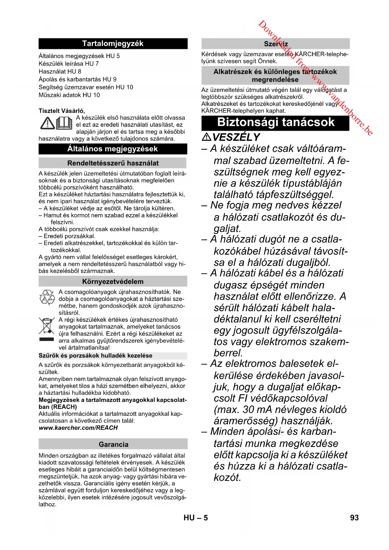 Максимальное напряжение в розетке устройстваСетевой предохранитель (инертный)Вместимость резервуараПотребление воды рукояткой Потребление воды насадкой для пола Сетевой шнурУровень звукового давления (EN 60704- 2-1) Вес без (принадлежностей) 92 RU Downloaded from www.vandenborre.be– 5 Tisztelt Vásárló,A készülék első használata előtt olvassa el ezt az eredeti használati utasítást, ez alapján járjon el és tartsa meg a későbbi használatra vagy a következő tulajdonos számára.A készülék jelen üzemeltetési útmutatóban foglalt leírá-soknak és a biztonsági utasításoknak megfelelően többcélú porszívóként használható.Ezt a készüléket háztartási használatra fejlesztettük ki, és nem ipari használat igénybevételére terveztük.– A készüléket védje az esőtől. Ne tárolja kültéren.– Hamut és kormot nem szabad ezzel a készülékkel felszívni.A többcélú porszívót csak ezekkel használja:– Eredeti porzsákkal.– Eredeti alkatrészekkel, tartozékokkal és külön tar-tozékokkal.A gyártó nem vállal felelősséget esetleges károkért, amelyek a nem rendeltetésszerű használatból vagy hi-bás kezelésből származnak.A csomagolóanyagok újrahasznosíthatók. Ne dobja a csomagolóanyagokat a háztartási sze-métbe, hanem gondoskodjék azok újrahaszno-sításról.A régi készülékek értékes újrahasznosítható anyagokat tartalmaznak, amelyeket tanácsos újra felhasználni. Ezért a régi készülékeket az arra alkalmas gyűjtőrendszerek igénybevételé-vel ártalmatlanítsa!A szűrők és porzsákok környezetbarát anyagokból ké-szültek.Amennyiben nem tartalmaznak olyan felszívott anyago-kat, amelyeket tilos a házi szemétben elhelyezni, akkor a háztartási hulladékba kidobható.Megjegyzések a tartalmazott anyagokkal kapcsolat-ban (REACH)Aktuális információkat a tartalmazott anyagokkal kap-csolatosan a következő címen talál: www.kaercher.com/REACHMinden országban az illetékes forgalmazó vállalat által kiadott szavatossági feltételek érvényesek. A készülék esetleges hibáit a garanciaidőn belül költségmentesen megszüntetjük, ha azok anyag- vagy gyártási hibára ve-zethetők vissza. Garanciális igény esetén kérjük, a számlával együtt forduljon kereskedőjéhez vagy a leg-közelebbi, ilyen esetek intézésére jogosult vevőszolgá-lathoz.Kérdések vagy üzemzavar esetén KÄRCHER-telephe-lyünk szívesen segít Önnek.Az üzemeltetési útmutató végén talál egy válogatást a legtöbbször szükséges alkatrészekről.Alkatrészeket és tartozékokat kereskedőjénél vagy KÄRCHER-telephelyen kaphat. VESZÉLY – A készüléket csak váltóáram- mal szabad üzemeltetni. A fe- szültségnek meg kell egyez- nie a készülék típustábláján található tápfeszültséggel. – Ne fogja meg nedves kézzel a hálózati csatlakozót és du- galjat. – A hálózati dugót ne a csatla- kozókábel húzásával távosít- sa el a hálózati dugaljból. – A hálózati kábel és a hálózati dugasz épségét minden használat előtt ellenőrizze. A sérült hálózati kábelt hala- déktalanul ki kell cseréltetni egy jogosult ügyfélszolgála- tos vagy elektromos szakem- berrel. – Az elektromos balesetek el- kerülése érdekében javasol- juk, hogy a dugaljat előkap- csolt FI védőkapcsolóval (max. 30 mA névleges kioldó áramerősség) használják. – Minden ápolási- és karban- tartási munka megkezdése előtt kapcsolja ki a készüléket és húzza ki a hálózati csatla- kozót. Tartalomjegyzék Általános megjegyzések HU 5Készülék leírása HU 7Használat HU 8Ápolás és karbantartás HU 9Segítség üzemzavar esetén HU 10Műszaki adatok HU 10 Általános megjegyzések Rendeltetésszerű használat Környezetvédelem Szűrők és porzsákok hulladék kezelése Garancia Szerviz Alkatrészek és különleges tartozékok megrendelése Biztonsági tanácsok 93HU Downloaded from www.vandenborre.be– 6 – Elektromos alkatrészeken történő javításokat és munká- kat csak jóváhagyott szerviz szolgálat végezhet el. FIGYELMEZTETÉS – Ez a készülék nem alkalmas arra, hogy korlátozott fizikai, érzékelő vagy szellemi ké- pességgel rendelkező vagy tapasztalat és/vagy ismeret hiányában lévő személyek használják, kivéve, ha a biz- tonságukért felelős személy felügyeli őket, vagy betanítot- ták őket a készülék használa- tára és megértették az ebből eredő veszélyeket. – Gyermekek a készüléket csak akkor használhatják, ha 8 év felettiek, és ha a bizton- ságukért felelős személy fel- ügyeli őket, vagy ha megtaní- tották őket a készülék hasz- nálatára és megértették az ebből eredő veszélyeket. – Gyermekeknek nem szabad a készülékkel játszani! – Gyerekeket felügyelni kell, annak biztosításáért, hogy a készülékkel ne játszanak. – Tisztítást és felhasználó általi karbantartást nem szabad gyermekeknek felügyelet nél- kül elvégezni. – A csomagolófóliát tartsa gyermekektől távol, fulladás veszélye áll fenn! – A készüléket minden haszná- lat után, és minden tisztítás/ karbantartás előtt kapcsolja ki. – Égésveszély. Ne szívjon fel égő vagy parázsló tárgyat. – Tilos a tűzveszélyes helyisé- gekben történő üzemeltetés. – A készüléket hab képződése vagy folyadék kifolyása ese- tén azonnal ki kell kapcsolni vagy ki kell húzni a hálózati dugót! – Ne használjon súrolószert, üveget vagy univerzális tisztí- tószert! A készüléket tilos víz- be meríteni. Bizonyos anyagok a beszívott levegővel robbanékony gőzöket vagy keverékeket alkothatnak! A következő anyagokat soha ne szívja fel: – Robban