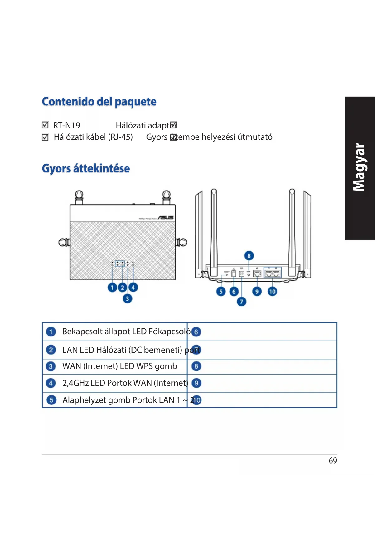 - Μπορείτεναπραγματοποιήσετελήψητουεγχειριδίουχρήσηςστο https://www.asus.com/support69 Magyar Gyors áttekintése Contenido del paquete RT-N19 Hálózati adapter Hálózati kábel (RJ-45) Gyors üzembe helyezési útmutató Bekapcsolt állapot LED Főkapcsoló LAN LED Hálózati (DC bemeneti) port WAN (Internet) LED WPS gomb 2,4GHz LED Portok WAN (Internet) Alaphelyzet gomb Portok LAN 1 ~ 2 Magyar70 Magyar A router elhelyezése A vezeték nélküli router és a hálózati eszközök közötti legjobb vezeték nélküli jelátvitel érdekében gondoskodjon a következőkről: