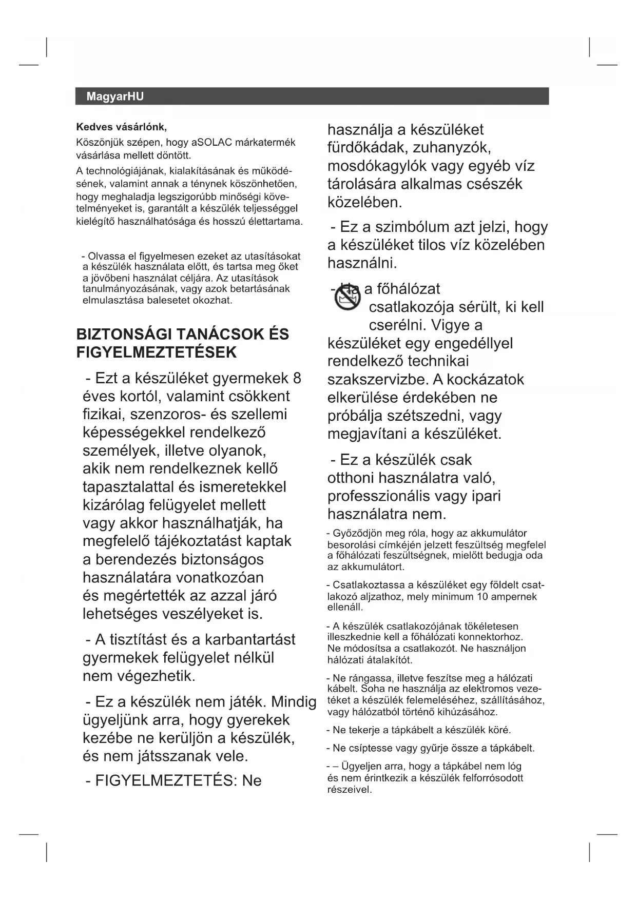 Ezt a készüléket gyermekek 8 éves kortól, valamint csökkent fizikai, szenzoros- és szellemi képességekkel rendelkező személyek, illetve oyanok, akik nem rendelkeznek kello tapasztalattal és ismeretekkel kizárólag felügyelet mellett vagy akkor használhatják, ha megfelelo tajékoztatást kaptaka berendezés biztonságos használatára vonatkozoan és megérététék az azzal jró lehetséges veszényeket is.