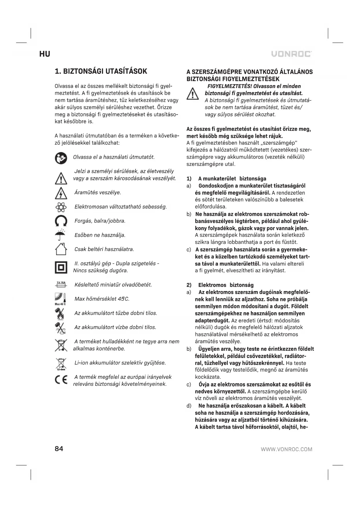 MULÁTORHOZ a) Ne bontsa szét az akkumulátort. Az veszélyes rövidzárlatot okozhat. b) Hőbehatástól védje az akkumulátort, pl. ne te- gye ki folyamatos erős napsugárzásnak, tűztől, víztől és más nedvességtől is védje. Robbanás- veszély. c) Ha az akkumulátor sérült, vagy rendellenesen használják, gőzök áramolhatnak belőle. Szel- lőztesse át amunkaterületet, és ha egészségi panaszai vannak, kérjen orvosi segítséget. Agőzök irritálhatják alégutakat. d) Az akkumulátort csak aVonroc termékéhez használja. Ezzel az intézkedéssel veszélyes túlterheléstől védi az akkumulátorát. e) Az akkumulátor megsérülhet, ha akülsejét he- gyes tárggyal (pl. szeggel, csavarhúzóval) vagy erőszakosan manipulálják. Belső rövidzárlat következhet be, amitől az akkumulátor leéghet, füstölhet, robbanhat vagy túlmelegedhet.