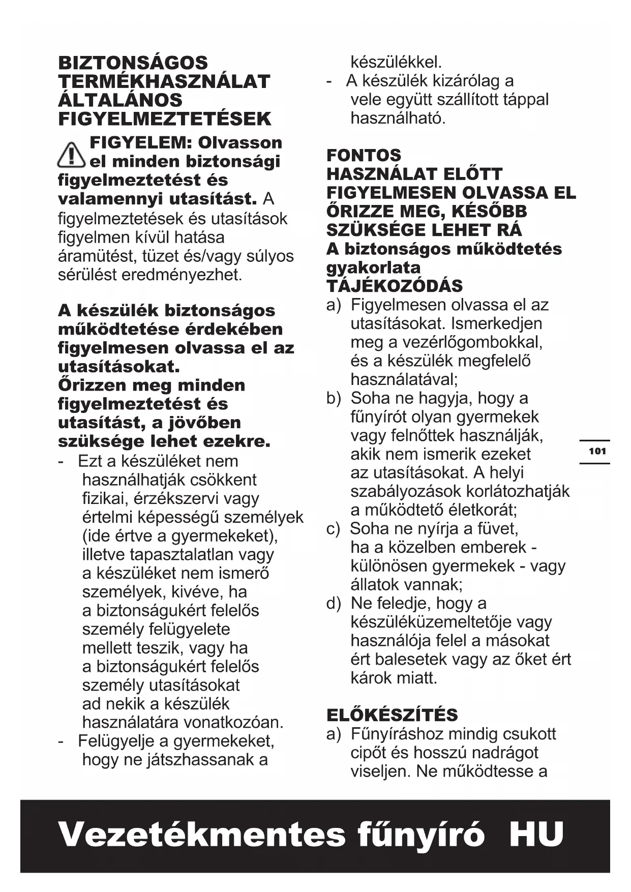 a) Figyelmesen olvassa el az utasításokat. Ismerkedjen meg a vezérlőgombokkal, és a készülék megfelelő használatával; b) Soha ne hagyja, hogy a fűnyírót olyan gyermekek vagy felnőttek használják, akik nem ismerik ezeket az utasításokat. A helyi szabályozások korlátozhatják a működtető életkorát; c) Soha ne nyírja a füvet, ha a közelben emberek - különösen gyermekek - vagy állatok vannak; d) Ne feledje, hogy a készüléküzemeltetője vagy használója felel a másokat ért balesetek vagy az őket ért károk miatt.